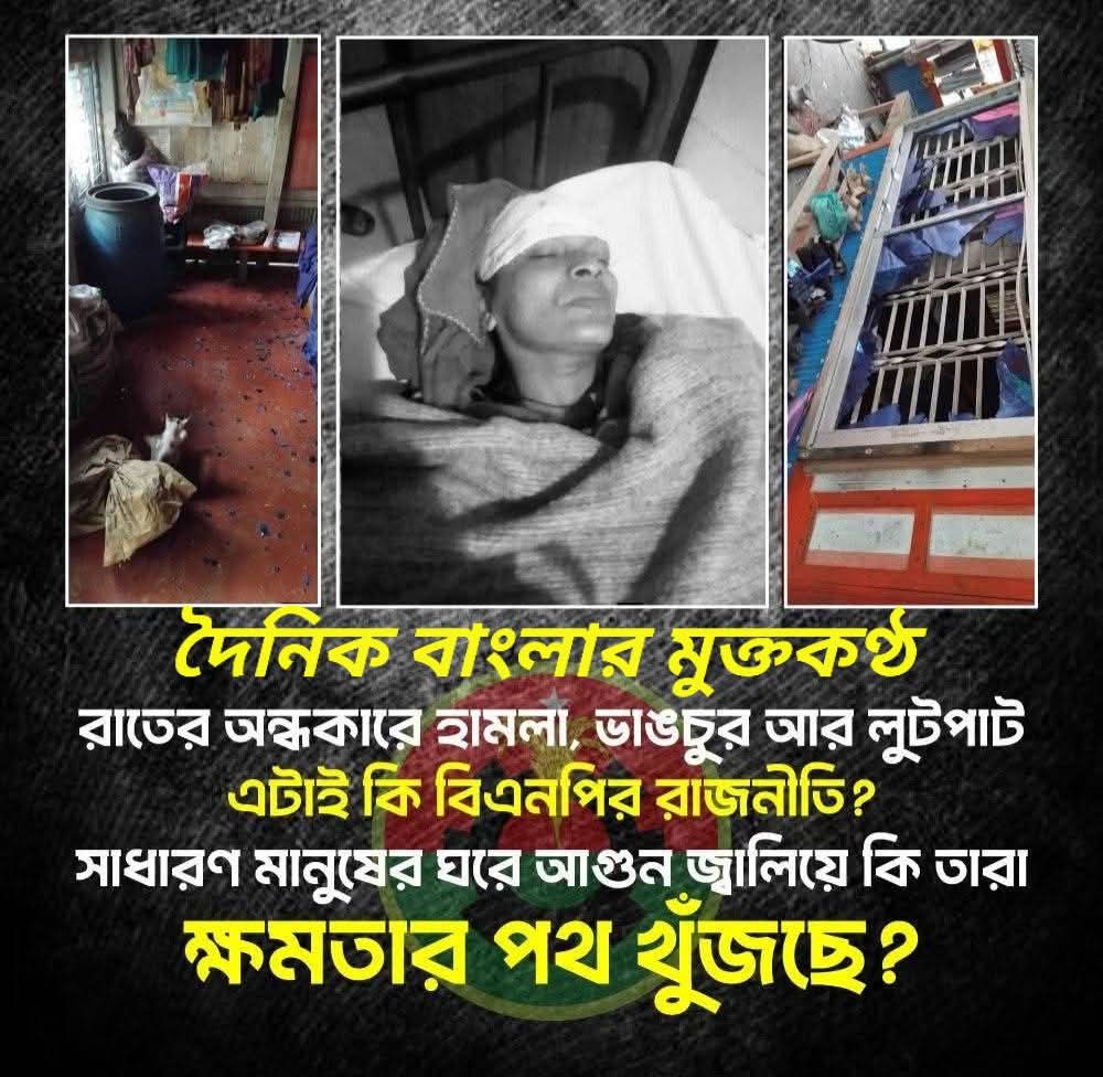 রাতের অন্ধকারে হামলা, ভাঙচুর আর লুটপাট এটাই কি বিএনপির রাজনীতি? সাধারণ মানুষের ঘরে আগুন জ্বালিয়ে কি তারা ক্ষমতার পথ খুঁজছে?
