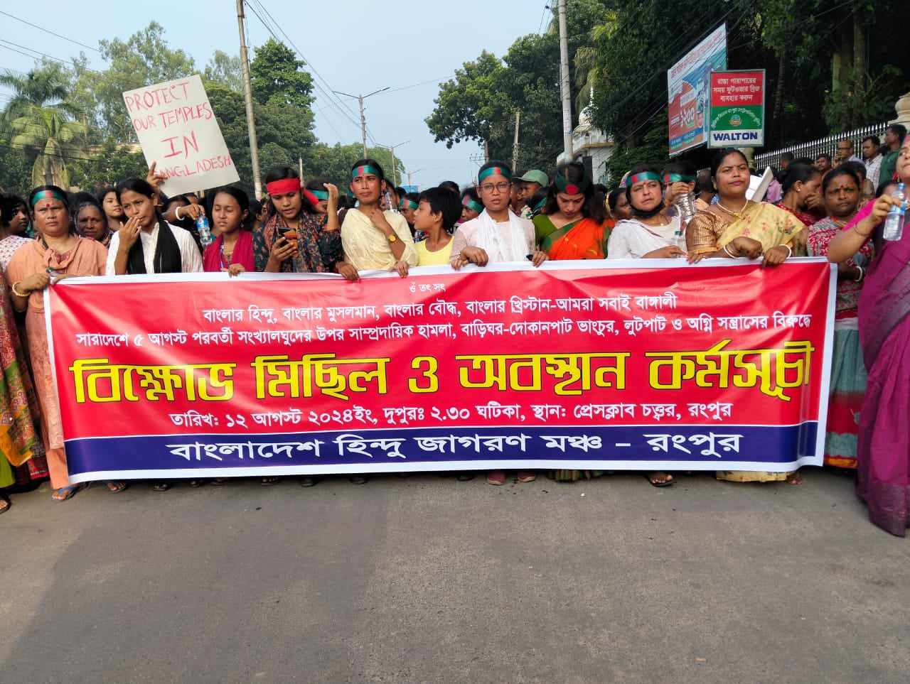 সারাদেশে ৫ আগষ্টের পর হিন্দু সম্প্রদায়ের ঘরবাড়িতে হামলা, ভাঙচুর, অগ্নিসংযোগ ও লুটপাটের প্রতিবাদে রংপুরে প্রতিবাদ সভা, মানববন্ধন ও মিছিল হয়েছে। সোমবার দুপুর ২ টায় পাবলিক লাইব্রেরি মাঠে বাংলাদেশ হিন্দু জাগরণ মঞ্চ রংপুর নামে এ কর্মসূচি পালন করা হয়। রংপুরের সকল হিন্দু সম্প্রদায়ের ছাত্রদের নিয়ে এ কর্মসূচির আয়োজন করেন।