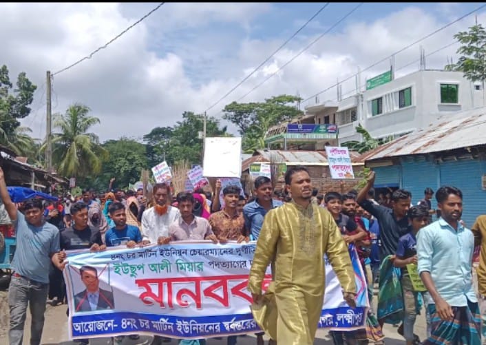 কমলনগর ইউপি চেয়ারম্যান ইউচুপ আলী পদত্যাগের দাবিতে ঝাড়ু মিছিল ও মানববন্ধন।
