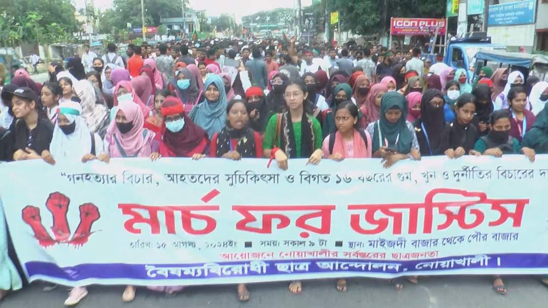 গণহত্যার বিচার, আহতদের সুচিাকৎসা ও বিগত ১৬ বছরের ঘুম, খুন ও দুর্নীতির বিচারের দাবীতে নোয়াখালীতে শিক্ষার্থীদের মার্চ ফর জাষ্টিস কর্মসূচী পালিত হয়েছে।