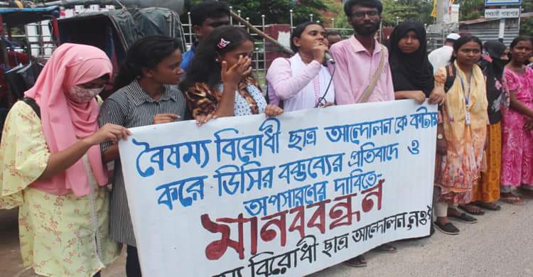 বৈষম্য বিরোধী ছাত্র আন্দোলনকে কটাক্ষ করে ডিসির বক্তব্যের প্রতিবাদ ও অপসারণের দাবিতে নওগাঁয় মানববন্ধন কর্মসূচী অনুষ্ঠিত হয়েছে। বেলা সাড়ে ১১টার দিকে বৈষম্য বিরোধী ছাত্র আন্দোলনের ব্যানারে শহরের মুক্তির মোড় শহীদ মিনারের সামনের সড়কে এ কর্মসূচী পালিত হয়।এসময় ছাত্র মিজানুর রহমানের সভাপতিত্বে মানববন্ধনে বক্তব্য রাখেন, মিতালি প্রামানিক, শিক্ষক সমাজের প্রতিনিধি জাহিদ রাব্বানী রাশিদ, নুসরাত জাহান জুথিসহ অন্যরা। মানববন্ধনে শিক্ষার্থী, অভিভাবকসহ বিভিন্ন শ্রেনীর পেশার মানুষ উপস্থিত ছিলেন। মানববন্ধন কর্মসূচী শেষে নওগাঁ জেলা প্রশাসক (ডিসি) গোলাম মওলা’র কুশপুত্তলিকা দাহ করে বিক্ষুদ্ধ শিক্ষার্থীরা। মানববন্ধন শেষে বিক্ষুদ্ধ শিক্ষার্থীরা বিক্ষোভ মিছিল করে। বক্তারা বলেন- গত মাসে একটি সরকারি অনুষ্ঠানে নওগাঁ জেলা প্রশাসক (ডিসি) গোলাম মওলা মন্তব্য করেন- শিক্ষার্থীরা না বুঝে রাস্তা অবরোধ করে আন্দোলন করছে। এতে করে রাস্তাঘাটে যানজট সৃষ্টি হয় এবং আমাদের দূর্ভোগ পোহাতে হয়। আন্দোলনের কারণে রেমিটেন্স কম যাচ্ছে। অভিভাবকদের তাদের সন্তানদের ঘরে রাখার নির্দেশনামুলক বক্তব্য রাখেন। জাতীর পিতাকে স্বপ্নের বাংলাদেশ করতে দেয়া হয়নি, তার পরিকল্পনা সফল হয়নি। নির্বিচারে পাখির মত গুলি করা হয়েছে। আজ একটি, দুটি লাশ রাস্তায় পরলে টকশো দিয়ে টেলিভিশন ফাঁটাই ফেলে বুদ্ধিজীবীরা। বঙ্গবন্ধুকে যখন স্বপরিবারে হত্যা করা হয়েছিল তখন তারা কোথায় ছিল। মায়া কান্না। সরকারি চাকুরিজীবি হিসেবে নয় নাগরিক হিসেবে যদি আগুন জ্বলে তবে আমারও গায়ে লাগবে। কথায় কথায় কেন আন্দোলনে নামেন, কথায় কথায় কেন ধ্বংসযঙ্গ চালানো হয়। দেশ তো ভালোই চলছে।ডিসির এমন বক্তব্যটি সামাজিক মাধ্যকে ছড়িয়ে পরলে শিক্ষার্থীদের মাঝে ক্ষোভ দেখা দেয়। এর প্রতিবাদে বৈষম্য বিরোধী ছাত্র আন্দোলনের শিক্ষার্থীরা মানববন্ধন কর্মসূচী পালন করে এবং তার অপসারণের দাবি জানায়।