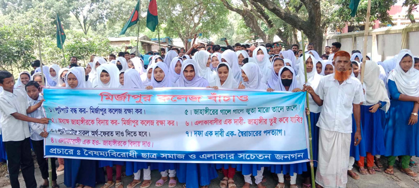 চাঁপাইনবাবগঞ্জের নাচোলে মির্জাপুর কলেজের অধ্যক্ষের পদত্যাগের দাবিতে এলাকার শিক্ষার্থী ও অভিভাবকগণ বিক্ষোভ কর্মসূচি পালন করেছেন। ১৯ আগস্ট সোমবার সকাল ১০টায় উপজেলার ফতেপুর ইউপির মির্জাপুর বাজারে মির্জাপুর কলেজের অধ্যক্ষ শেখ জাহাঙ্গীর আলমের স্বেচ্ছাচারিতা, অনিয়ম ও দূর্ণীতির অভিযোগে তার পদত্যাগের দাবিতে এক বিক্ষোভ কর্মসূচি পালন করেন শিক্ষার্থী, অভিভাবক ও স্থানীয় সচেতন নাগরিকমহল। এ উপলক্ষে মির্জাপুর কলেজের অভিভাবক, ছাত্র-ছাত্রী ও স্থানীয়দের অংশগ্রহণে একটি বিক্ষোভ র্যালী মির্জাপুর বাজার প্রদক্ষিণ শেষে কলেজ চত্বরে মিলিত হয়। সেখানে কলেজের অধ্যক্ষ শেখ জাহাঙ্গীর আলম সাময়িক ছুটিতে থাকা অবস্থায় তাঁর অনিয়ম, দূর্ণীতি ও স্বেচ্ছাচারিতার ফিরিস্তি তুলে ধরে বক্তব্য রাখেন সচেতন নাগিরিকের পক্ষে কবির হোসেন, ওই কলেজের একাদ্বশ শ্রেণীর ছাত্র সোহাগ আলী, দ্বাদশ শ্রেণীর ছাত্র বিপ্লব, সাবেক ছাত্র ফরহাদ হোসেন ও ওয়াসিম আলী ও শিক্ষানুরাগী গোলাম মোস্তফা। বিক্ষোভ সমাবেশে কবির হোসেন জানান, অধ্যক্ষ শেখ জাহাঙ্গীর আলম স্বেচ্ছাচারিতার মাধ্যমে বিগত ২০২১ সালের চলমান বৈধ কমিটিকে গোপনে বাতিল দেখিয়ে তার মনগড়া কাগুজে পকেট কমিটি করে ততকালিন বোর্ড চেয়ারম্যানের নিকট থেকে বৈধ করে নেন। ওই কমিটির বৈধতা চ্যালেঞ্জ করে গত ১৫/০২/২০২১ তারিখে চাঁপাইনবাবগঞ্জের সহকারী জজ আদালতে(অপ্র-২৭/২০২১ নং)একটি রীট হয়। দীর্ঘ শুনানীর পর বিজ্ঞ আদালত গত ১৫/১২/২০২১ তারিখে ভারপ্রাপ্ত অধ্যক্ষ ও তার কার্যক্রম বিধি বহির্ভূত মর্মে আদেশ দেন। কিন্তু অধ্যক্ষ আদালতের আদেশ পাস কাটিয়ে তাঁর পকেট কমিটির মাধ্যমে কলেজের উন্নয়ন ফান্ডে টাকা জমা করার কথা বলে প্রায় ৮১ লাখ টাকার বিনিময়ে কলেজের ল্যাব সহকারি, ল্যাব এ্যাসিসটেন্ট(উদ্ভিদ বিজ্ঞান), ল্যাব এ্যাসিসটেন্ট(রসায়ন), ল্যাব এ্যাসিসটেন্ট(পদার্থ বিজ্ঞান) ও ল্যাব সহকারি পদে ৫ জনকে রাতারাতি নিয়োগ দেন। কিন্তু ওই টাকা কলেজের উন্নয়ন ফান্ডে জামা না করে সমস্ত টাকা অধ্যক্ষ আত্মসাত করেছেন। কলেজের নামে দানকৃত জমিতে ভবন নির্মান না করে অন্যের জমিতে কলেজ ভবন নির্মান, পরিত্যক্ত ভবনের ইট বিক্রি, আমগাছের বাৎসরিক লীজের টাকা ও শিক্ষকদের টাকায় ক্রয় করা ৬লাখ টাকা মূল্যের শিক্ষার্থী বহনের গাড়ি অবৈধভাবে বিক্রি করে টাকা আত্মস্বাতসহ বিভিন্ন অনিয়ম ধূর্ণীতির অভিযোগে অবিলম্বে তাঁর পদত্যাগের দাবী জানান অভিভাবক, শিক্ষার্থী ও স্থানীয় জনতা। এসময় শিক্ষার্থীদের দাবির প্রেক্ষিতে সাময়িক ভারপ্রাপ্ত অধ্যক্ষ আতাউর রহমান(ইসলামী শিক্ষা) তাঁর দায়িত্ব থেকে স্বেচ্ছায় পদত্যাগ করেন।