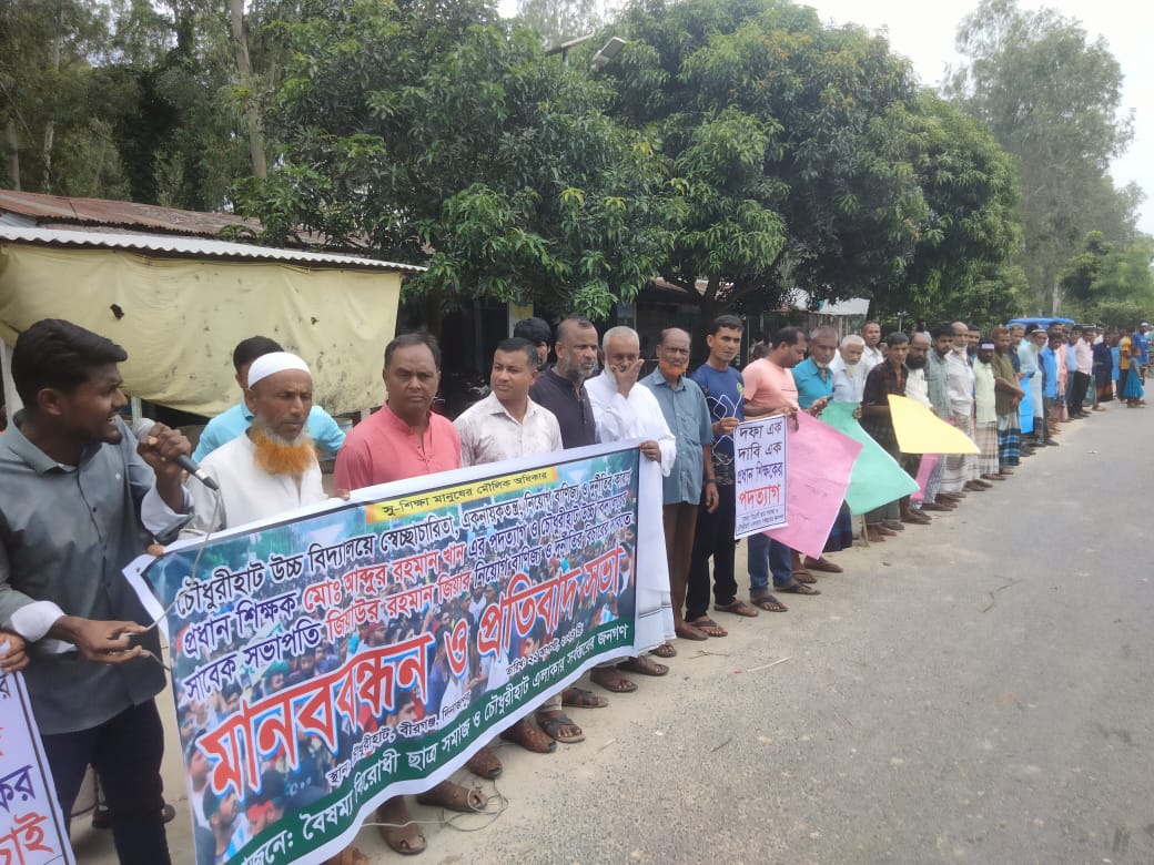 দিনাজপুরের বীরগঞ্জ উপজেলায় চৌধুরীহাট উচ্চ বিদ্যালয়ের সামনে, বৈষম্য বিরোধী ছাত্র সমাজ ও চৌধুরীহাট এলাকার সর্বস্তরের জনগনের আয়োজনে, বীরগঞ্জ- খানসামা মহাসড়কে চৌধুরীহাট উচ্চ বিদ্যালয়ে, স্বেচ্ছাচারিতা একনায়কতন্ত্র, নিয়োগ বানিজ্য ও দূর্নীতির অভিযোগে প্রধান শিক্ষক আব্দুর রহমান খানের পদত্যাগ ও চৌধুরীহাট উচ্চ বিদ্যালয়ের সাবেক সভাপতি জিয়াউর রহমান জিয়ার, নিয়োগ বানিজ্য ৮৬ লাখ টাকা আত্নসাত ও দূর্নীতির বিচারের দাবীতে মানব বন্ধন ও প্রতিবাদ সভায় ২ ঘণ্টা ব্যাপী সড়ক অবরোধ করে রাখে বৈষম্য বিরোধী ছাত্র সমাজ ও এলাকার জনগণ। বৃহস্পতিবার সকাল ১১ টায় ১০নং মোহনপুর ইউনিয়নের ইউপি সদস্য ফেরদৌস আলীর সভাপতিত্বে মানববন্দন ও প্রতিবাদ সভায় বক্তব্য রাখেন ১০নং মোহনপুর ইউনিয়নের চেয়ারম্যান শাহিনুর রহমান চৌধুরী শাহিন, ৯নং ওয়ার্ডের সাবেক ইউপি সদস্য আব্দুর সাত্তার, বৈষম্যবিরোধী ছাত্র সমাজের সদস্য পিন্টু খান, পাকেরহাট টেকনিক্যাল কলেজের প্রভাষক আব্দুর রহমান সহ আরো অনেকে।