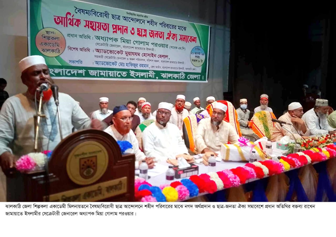 'গত ১৫ বছর হাসিনা অনেক মানুষ হত্যা করেছে। শেষ মুহুর্তে ক্ষমতায় টিকে থাকতে ছাত্রদের উপর গুলিবর্ষন করিয়েছে সৈরাচার হাসিনা। আমরা ১৫ বছরে পারিনি ভোট ডাকাত হাসিনাকে হটাতে। কিন্তু শিক্ষার্থীরা হাসিনার বুলেটের সামনে বুক পেতে দিয়ে দেশকে মুক্ত করেছে। ফ্যাসিষ্ট হাসিনা আজ ছাত্র-জনতার বিক্ষোভে দেশ ছেড়ে পালিয়ে গেছে। যারা শহীদ হয়েছে তারা নিজের স্বার্থে আন্দোলন করেনি, তারা দেশের স্বার্থে আন্দোলন করেছে জামায়েতে ইসলামী দলটি সবসময় নিহতের পরিবারের পাশে থাকবে।' বাংলাদেশ জামায়াতে ইসলামী ঝালকাঠি জেলা কতৃক আয়োজিত বৈষম্যবিরোধী ছাত্র আন্দোলনে শহীদ পরিবারের মাঝে আর্থিক সহায়তা প্রদান ও ছাত্র জনতা ঐক্য সমাবেশে প্রধান অতিথির বক্তব্যে দলটির সেক্রেটারী জেনারেল সাবেক সংসদ সদস্য অধ্যাপক মিয়া গোলাম পরওয়ার একথা বলেন।