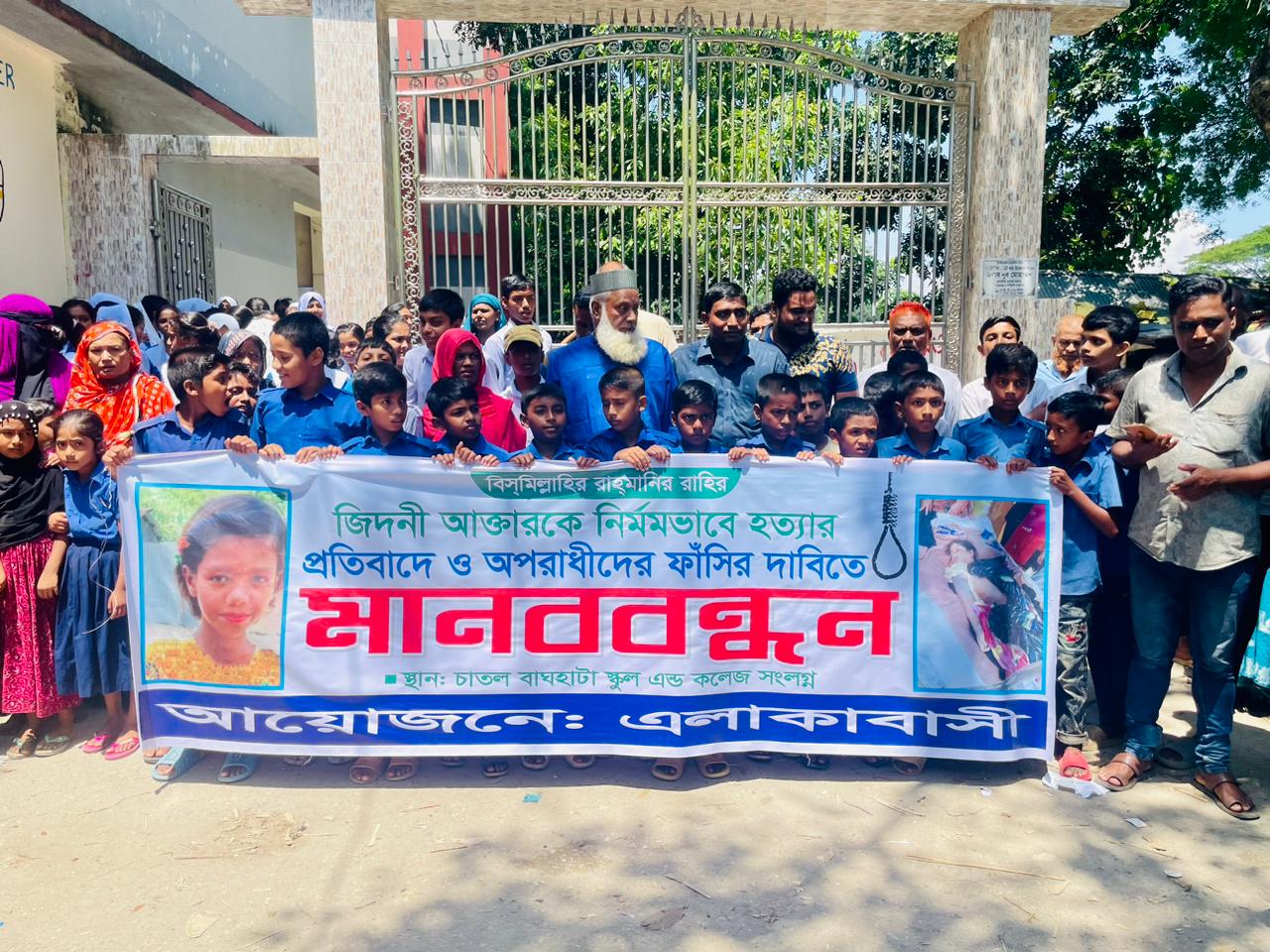 কিশোরগঞ্জের কটিয়াদীতে জিদনী আক্তারকে নির্মমভাবে হত্যার প্রতিবাদে ও অপরাধের ফাঁসির দাবিতে মানববন্ধন