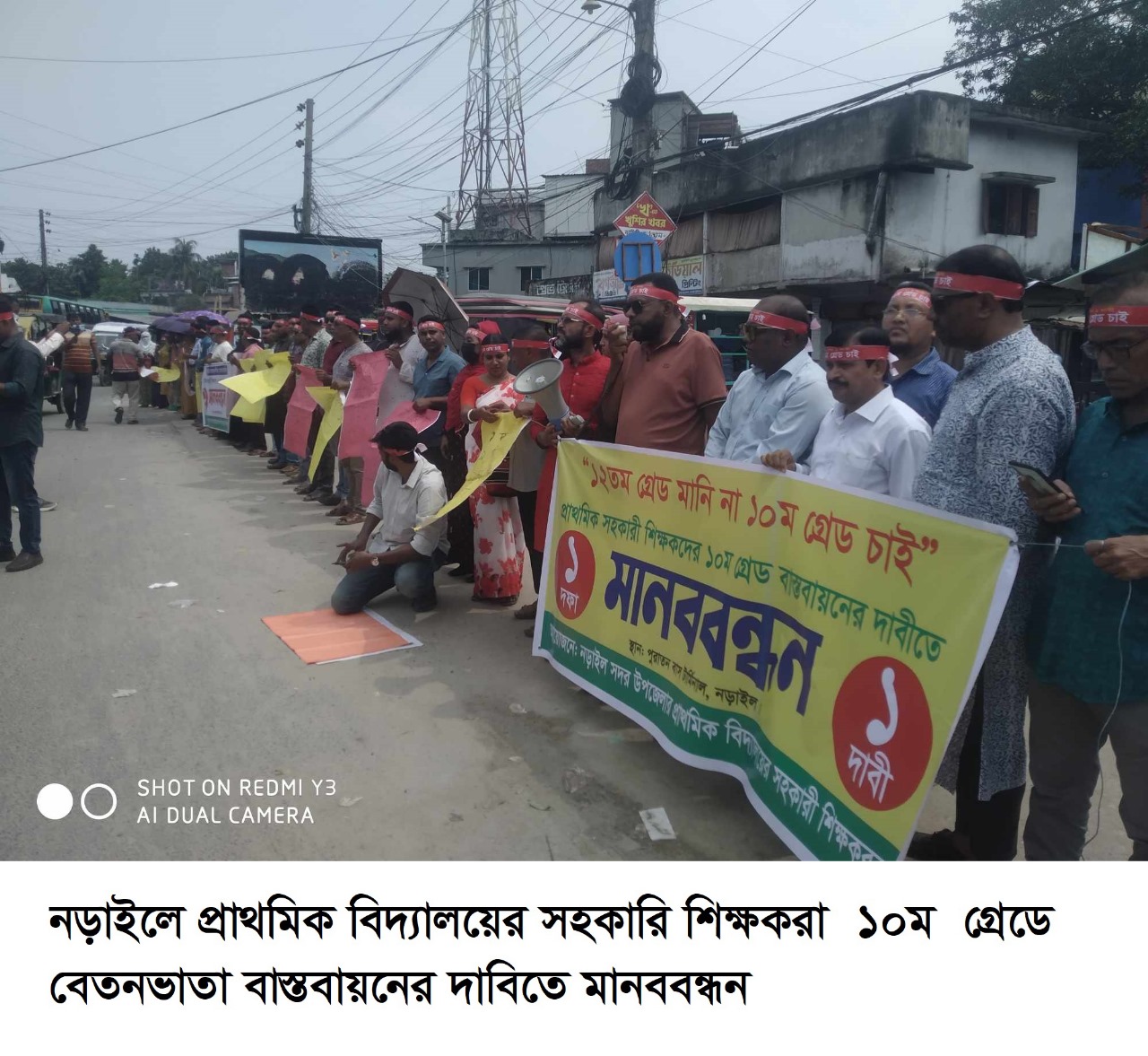 নড়াইলে ১০ম গ্রেডে বেতনভাতা বাস্তবায়নের দাবিতে প্রাথমিক সহকারি শিক্ষকদের মানববন্ধন