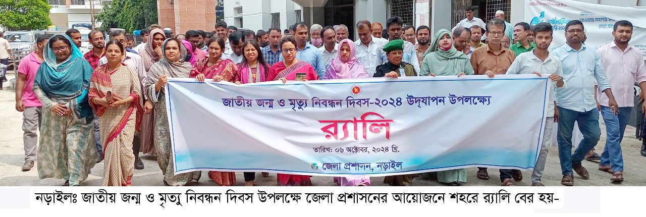 জন্ম-মৃত্যু নিবন্ধন, আনবে দেশে সুশাসন’ এ প্রতিপাদ্যকে ধারণ করে নড়াইলে জাতীয় জন্ম ও মৃত্যু নিবন্ধন দিবস পালিত হয়েছে। রোববার (৬ অক্টোবর) নড়াইল জেলা প্রশাসনের আয়োজনে জেলা প্রশাসকের কার্যালয়ের সামনে থেকে সকাল-১০টায় একটি র্যালি বের হয়। র্যালিটি শহরের বিভিন্ন সড়ক প্রদক্ষিণ শেষে একই স্থানে এসে শেষ হয়। পরে জেলা প্রশাসকের সম্মেলন কক্ষে নড়াইল স্থানীয় সরকার বিভাগের উপ-পরিচালক জুলিয়া সুকায়নার সভাপতিত্বে বক্তব্য দেন- জেলা প্রশাসক শারমিন আক্তার জাহান, সদর উপজেলা নির্বাহী কর্মকর্তা রিপন বিম্বাস, কৃষি স¤প্রসারণ অধিদপ্তর নড়াইলের অতিরিক্ত উপ-পরিচালক (উদ্যান) মো. জাহিদুল ইসলাম বিশ্বাস, বীরমুক্তিযোদ্ধা তবিবর রহমান খান প্রমুখ। বক্তারা, জন্ম-মৃত্যু নিবন্ধনের কাজে সার্ভার জটিলতাসহ বিভিন্ন সমস্যার কথা তুলে ধরেন। পাশাপাশি জন্ম-মৃত্যুর নিবন্ধনে সাধারণ মানুষের মাঝে সচেতনতা সৃষ্টিতে সবাইকে আন্তরিকভাবে কাজ করার অনুরোধ জানান।