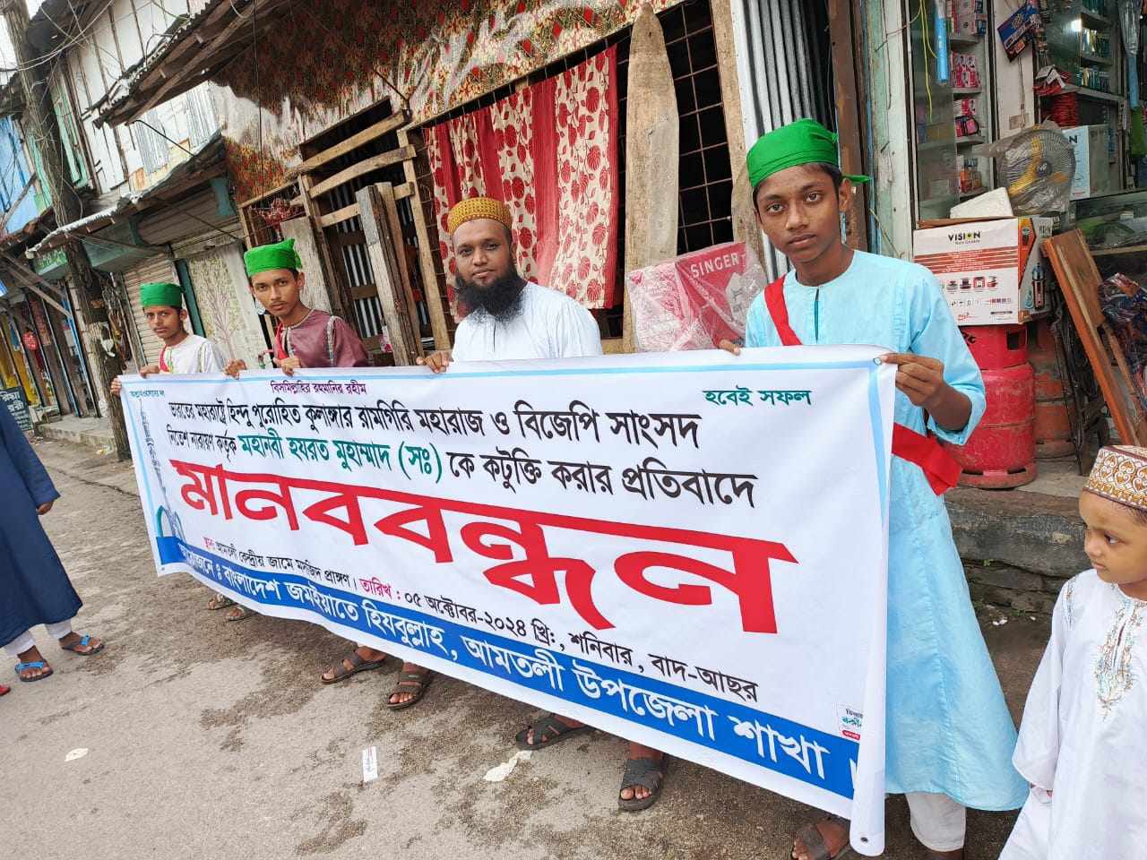 আমতলীতে নবীজিকে কটুক্তি করায় বিক্ষোভ মিছিল ও মানববন্ধন করেন।