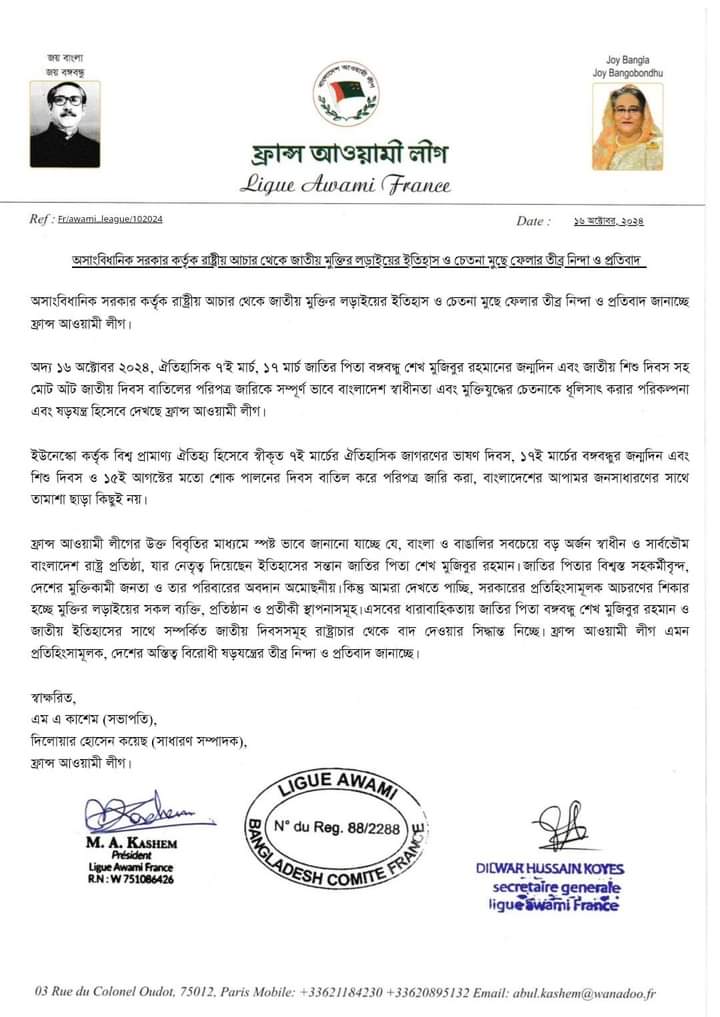 ফ্রান্স আওয়ামী লীগের উক্ত বিবৃতির মাধ্যমে স্পষ্ট ভাবে জানানো যাচ্ছে যে, বাংলা ও বাঙালির সবচেয়ে বড় অর্জন স্বাধীন ও সার্বভৌম বাংলাদেশ রাষ্ট্র প্রতিষ্ঠা, যার নেতৃত্ব দিয়েছেন ইতিহাসের সন্তান জাতির পিতা শেখ মুজিবুর রহমান। জাতির পিতার বিশ্বস্ত সহকর্মীবৃন্দ, দেশের মুক্তিকামী জনতা ও তার পরিবারের অবদান অমোছনীয়। কিন্তু আমরা দেখতে পাচ্ছি, সরকারের প্রতিহিংসামূলক আচরণের শিকার হচ্ছে মুক্তির লড়াইয়ের সকল ব্যক্তি, প্রতিষ্ঠান ও প্রতীকী স্থাপনাসমূহ। এসবের ধারাবাহিকতায় জাতির পিতা বঙ্গবন্ধু শেখ মুজিবুর রহমান ও জাতীয় ইতিহাসের সাথে সম্পর্কিত জাতীয় দিবসসমূহ রাষ্ট্রাচার থেকে বাদ দেওয়ার সিদ্ধান্ত নিচ্ছে। ফ্রান্স আওয়ামী লীগ এমন প্রতিহিংসামূলক, দেশের অস্তিত্ব বিরোধী ষড়যন্ত্রের তীব্র নিন্দা ও প্রতিবাদ জানাচ্ছে।