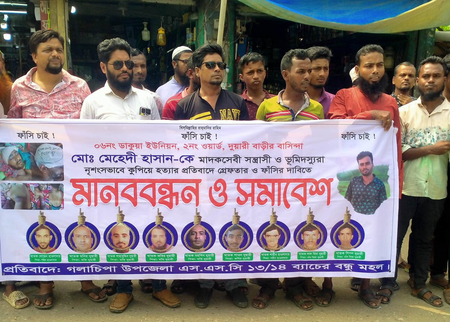 গলাচিপায় মেহেদী হাসান হত্যার বিচারের দাবিতে মানববন্ধন করেছে স্বজন ও এলাকাবাসী। রবিবার (২০ অক্টোবর) সকাল ১০ টায় গলাচিপা থানা কমপ্লেক্সের সামনের সড়কে ঘণ্টাব্যাপী মানববন্ধন হয়। মানববন্ধন শেষে হত্যাকাণ্ডে জড়িতদের বিচারের দাবিতে বিক্ষোভ মিছিল করে এলাকাবাসী। এসময় উপস্থিত ছিলেন নিহতের বন্ধু, স্বজন, ব্যবসায়ী, রাজনৈতিক দলের নেতৃবৃন্দসহ স্থানীয় জনগণ। মানববন্ধনে বক্তব্য রাখেন, উপজেলা বিএনপির সাবেক যুগ্ম-সাধারণ সম্পাদক আব্দুস সোবহান, পৌর বিএনপির সাবেক সভাপতি ও সাবেক কাউন্সিলর মো. রফিকুল ইসলাম খান, বণিক সমিতির সাধারণ সম্পাদক তাপস দত্ত ও নিহতের বাবা ইউনূস দুয়ারী। মানববন্ধনের ব্যানারে হত্যায় জড়িত মোমেন হাওলাদার, মনির দুয়ারী, শাহাবুদ্দিন দুয়ারী, কবির দুয়ারী, মহসিন দুয়ারী, শাওন দুয়ারী, শাহীন হাওলাদার, লাল মিয়া দুয়ারী ও শিপন দুয়ারীর ছবি দেয়া হয়। এসময় দোষীদের দ্রুত গ্রেফতার ও ফাঁসি দিয়ে দৃষ্টান্ত মূলক শাস্তি দাবি করেন বক্তারা। এর আগে গত বৃহস্পতিবার (১৭ অক্টোবর) বিকেলে ডাকুয়া ইউনিয়নের আটখালী বাজারে মেহেদী হত্যার বিচারের দাবিতে মানববন্ধন করে এলাকাবাসী। গত বৃহস্পতিবার (১০ অক্টোবর) ডাকুয়া ইউনিয়নের ১ নম্বর ওয়ার্ড পাড় ডাকুয়া গ্রামে পানের বরজ নির্মাণ করতে গিয়ে প্রতিপক্ষ মনির দুয়ারী, মোমেন ও তার সঙ্গীদের হামলায় গুরুতর আহত হন মেহেদী। এক সপ্তাহ মুমূর্ষু অবস্থায় চিকিৎসাধীন মেহেদী বুধবার (১৬ অক্টোবর) দুপুরে ঢাকা মেডিকেল হাসপাতালে মারা যায়।