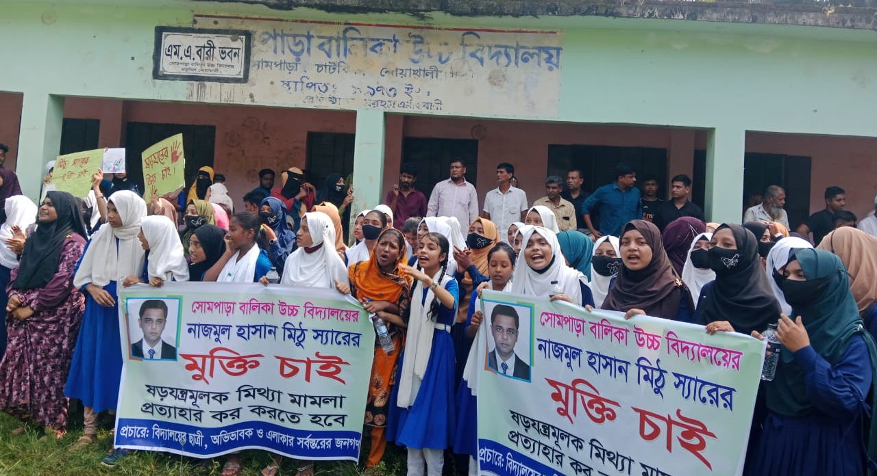 সোমপাড়া বালিকা উচ্চবিদ্যালয়ের শিক্ষক মিঠু স্যার এর মুক্তির দাবিতে শিক্ষার্থী ও অভিভাবকদের আন্দোলন ও মানববন্ধন।