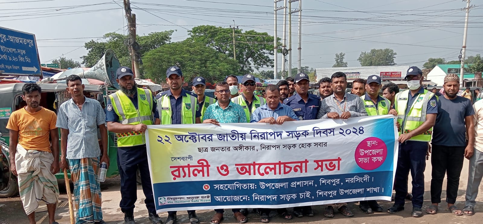 নরসিংদীর শিবপুরে প্রশাসন এর সহযোগিতায় জাতীয় নিরাপদ সড়ক চাই পালিত হয়েছে । মঙ্গলবার (২২ অক্টোবর) সকালে"ছাত্র জনতার অঙ্গীকার,নিরাপদ সড়ক হোক সবার,এ প্রতিপাদ্যকে সামনে নিয়ে জাতীয় নিরাপদ সড়ক চাই শিবপুর উপজেলা শাখার সভাপতি আব্দুল হান্নান মানিক এর সভাপতিত্বে এক র্যালী বের হয় ও পরে উপজেলা পরিষদ সম্মেলন কক্ষে আলোচনা সভা অনুষ্ঠিত হয়। উক্ত আলোচনা সভায় প্রধান অতিথি হিসেবে উপস্থিত ছিলেন,শিবপুর উপজেলা নির্বাহী অফিসার ও শিবপুর উপজেলা শাখার নিরাপদ সড়ক চাই এর উপদেষ্টা,শাহ মোঃ সজীব। এ সময় ইটাখোলা হাইওয়ে থানা পুলিশের অফিসার ইনচার্জ মোঃ সোহেল সারওয়ার,নরসিংদীর টি আই মোঃ সাইফুল ইসলাম সহ নিরাপদ সড়ক চাই সংগঠনটির সম্পাদক মণ্ডলীর অন্যান্য