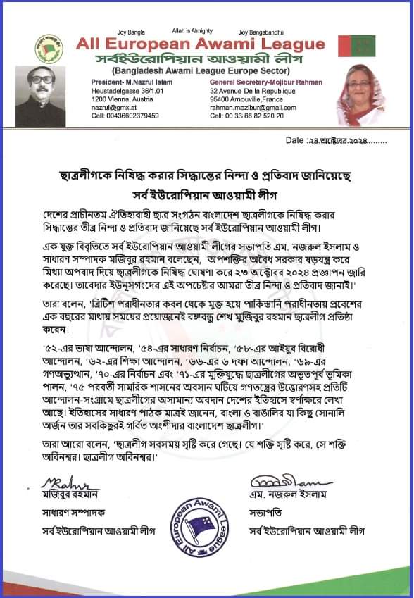 ⁨ছাত্রলীগকে নিষিদ্ধ করার সিদ্ধান্তের তীব্র নিন্দা ও প্রতিবাদ জানিয়েছে সর্ব ইউরোপিয়ান আওয়ামী লীগ