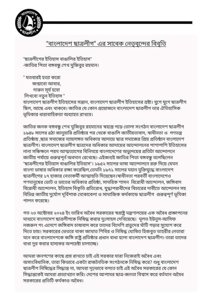 ইতিহাস বিকৃতি প্রতিরোধ,যুদ্ধাপরাধী দের বিচারের দাবীতে আন্দোলন সহ বিভিন্ন জাতীয় দুর্যোগ দূর্বিপাক মোকাবেলা ও সামাজিক কর্মকান্ডে ছাত্রলীগ গুরুত্বপূর্ণ ভূমিকা পালন করেছে। গত ২৩ অক্টোবর ২০২৪ ইং তারিখ অবৈধ সরকারের স্বরাষ্ট্র মন্ত্রণালয়ের এক অবৈধ প্রজ্ঞাপনের মাধ্যমে বাংলাদেশ ছাত্রলীগকে নিষিদ্ধ করার দুঃসাহস দেখিয়েছে। মূলত ইউনুস-আসিফ নজরুল গং এদেশে জঙ্গিবাদ চাষাবাদ করে তাদের বিদেশি প্রভুদের ঘাঁটি গড়ার সুযোগ করে দিতে চায়। সরকারের ভেতরে থাকা জামাত শিবির ও নিষিদ্ধ ঘোষিত হিজবুত তাহরীর নেতারা মনে করে বাংলাদেশকে জঙ্গি রাষ্ট্র প্রতিষ্ঠার প্রধান বাধা হলো বাংলাদেশ ছাত্রলীগ। তারা তাদের বাধা দুর করার হাস্যকর অপচেষ্টা চালাচ্ছে। আমরা জনগণের কাছে প্রশ্ন রাখতে চাই এই সরকার যারা নিজেরাই অবৈধ এবং অসাংবিধানিক,তারা কিভাবে একটা রাজনৈতিক সংগঠনকে নিষিদ্ধ করে? শুধু বাংলাদেশ ছাত্রলীগ নিষিদ্ধের সিদ্ধান্ত না,আমরা দৃঢ়ভাবে বলতে চাই এই অবৈধ সরকারের যে কোন সিদ্ধান্তকেই আমরা প্রত্যাখ্যান করি। দেশের আপামর ছাত্র-জনতা বিশ্বাস করে বর্তমান অবৈধ সরকারের প্রতিটি কর্মকাণ্ড অবৈধ। এই অবৈধ সরকারের কর্মকাণ্ডের নিন্দাও প্রতিবাদ জানিয়ে তাদেরকে প্রকারান্তরে স্বীকৃতি দেয়ার অভিপ্রায় আমাদের নেই,বরং তাদেরকে স্মরণ করিয়ে দিতে চাই,এসব হাস্যকর দুরভি সন্ধিমূলক সিদ্ধান্ত নিয়ে লাভ নেই;বাংলাদেশ ছাত্রলীগ অচিরেই তার স্বমহিমায় উদ্ভাসিত হবে।আপনাদের এই দুঃসাহস অচিরেই দু:স্বপ্নে পরিনত হবে। জয় বাংলা জয় বঙ্গবন্ধু।। বিবৃতিতে স্বাক্ষরকারী নেতৃবৃন্দঃ ১.ডাক্তার মোস্তফা জালাল মহিউদ্দিন (সাবেক সভাপতি) ২.এ্যাডভোকেট জাহাঙ্গীর কবির নানক (সাবেক সাধারণ সম্পাদক) ৩.আব্দুর রহমান (সাবেক সাধারণ সম্পাদক) ৪.অসীম কুমার উকিল (সাবেক সাধারণ সম্পাদক)