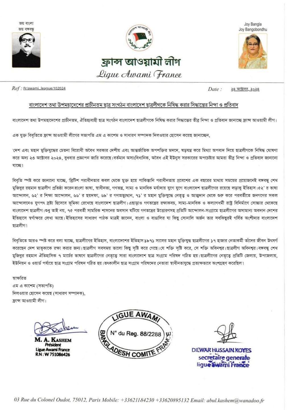 এক যুক্ত বিবৃতিতে ফ্রান্স আওয়ামী লীগের সভাপতি এম এ কাশেম ও সাধারণ সম্পাদক দিলওয়ার হোসেন কয়েছ জানাচ্ছেন,দেশ এবং মহান মুক্তিযুদ্ধের চেতনা বিরোধী অবৈধ সরকার দেশীয় এবং আন্তর্জাতিক অপশক্তির মদদে,ষড়যন্ত্র করে মিথ্যা অপবাদ দিয়ে ছাত্রলীগকে নিষিদ্ধ ঘোষণা করে অদ্য ২৩ অক্টোবর ২০২৪,বুধবার প্রজ্ঞাপন জারি করেছে। বর্তমান অসাংবিধানিক,অবৈধ এই ইউনুস সরকারের অপচেষ্টার আমরা তীব্র নিন্দা ও প্রতিবাদ জানানো যাচ্ছে। বিবৃতি স্পষ্ট করে জানানো যাচ্ছে,ব্রিটিশ পরাধীনতার কবল থেকে মুক্ত হয়ে পাকিস্তানি পরাধীনতায় প্রবেশের এক বছরের মাথায় সময়ের প্রয়োজনেই বঙ্গবন্ধু শেখ মুজিবুর রহমান ছাত্রলীগ প্রতিষ্ঠা করেন।বাংলা ভাষা,স্বাধীনতা,গণতন্ত্র,সাম্য ও মানবিক মর্যাদায় যুগে যুগে বাংলাদেশ ছাত্রলীগের রয়েছে লড়াকু ইতিহাস। ৫২ র ভাষা আন্দোলন,৬২’র শিক্ষা আন্দোলন,৬৬’র ছয়দফা,৬৯’র গণঅভ্যুত্থান,৭১’র মহান মুক্তিযুদ্ধে নেতৃত্ব ও আত্মদান থেকে শুরু করে পরবর্তীতে জনগণের সকল আন্দোলনেও যুগপৎ স্রষ্টা হিসেবে ভূমিকা রেখেছে বাংলাদেশ ছাত্রলীগ। এছাড়াও গণতন্ত্রের রক্ষাকবচ,সাম্য-মানবিক ও কল্যাণধর্মী রাষ্ট্র বিনির্মাণে সোচ্চার থেকেছে বাংলাদেশ ছাত্রলীগ। শুধু তাই নয়,৭৫ পরবর্তী সামরিক শাসনের অবসান ঘটিয়ে গণতন্ত্রের উত্তোরণসহ প্রতিটি আন্দোলন-সংগ্রামে ছাত্রলীগ এর অসামান্য অবদান দেশের ইতিহাসে স্বর্ণাক্ষরে লেখা আছে। ইতিহাসের সাধারণ পাঠক মাত্রই জানেন,বাংলা ও বাঙালির যা কিছু সোনালি অর্জন তার সবকিছুরই গর্বিত অংশীদার বাংলাদেশ ছাত্রলীগ। বিবৃতিতে আরও স্পষ্ট করে বলা যাচ্ছে,ছাত্রলীগের ইতিহাস,বাংলাদেশের ইতিহাস