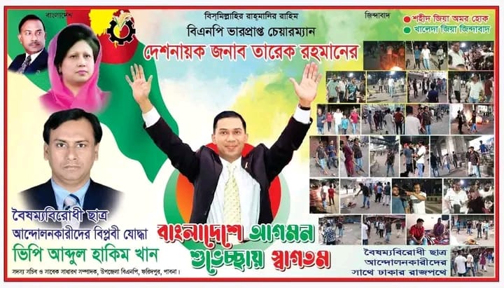 বৈষম্য বিরোধী ছাএ আন্দোলনের অন্যতম সহযোদ্ধা, সাবেক ফরিদপুর উপজেলার,সাধারণ সম্পাদক সাবেক, বগুড়া আজিজুল হক কলেজের ভিপি,বর্তমান ফরিদপুর উপজেলার বিএনপির সদস্য সচিব ভিপি আব্দুল হাকিম খাঁন তিনি বার বার মিথ্যা সাজানো ফ্যাসিস্ট খুনি হাসিনা সরকারের পেটোয়া বাহিনী দিয়ে আটক করে জেল খাটিয়েছেন। সেই মোদের পাবনার ফরিদপুর উপজেলার আব্দুল হাকিম ভাই। তিনি এক সময় উপজেলা চেয়ারম্যান পদপ্রার্থী ছিলেন কিন্তু রাজনৈতিক কিছু মার প্যাচে ফেলে দিয়ে অল্প কিছু ভোটের ব্যাবধানে বিজয়ী হতে দেওয়া হয়নি। সেই মোদের আব্দুল হাকিম ভাই।বিভিন্ন মিছিল মিটিংয়ে আগে নেতৃত্ব দিয়ে থাকেন। আগামী নির্বাচনে এমপি হিসাবে দেখতে চাই। জননেতা জনাব তারেক রহমানের হাত ধরে পাবনা-৩ আসনে( চাটমোহর ভাঙ্গুড়া ফরিদপুর) এম পি হিসাবে দেখতে চাই।