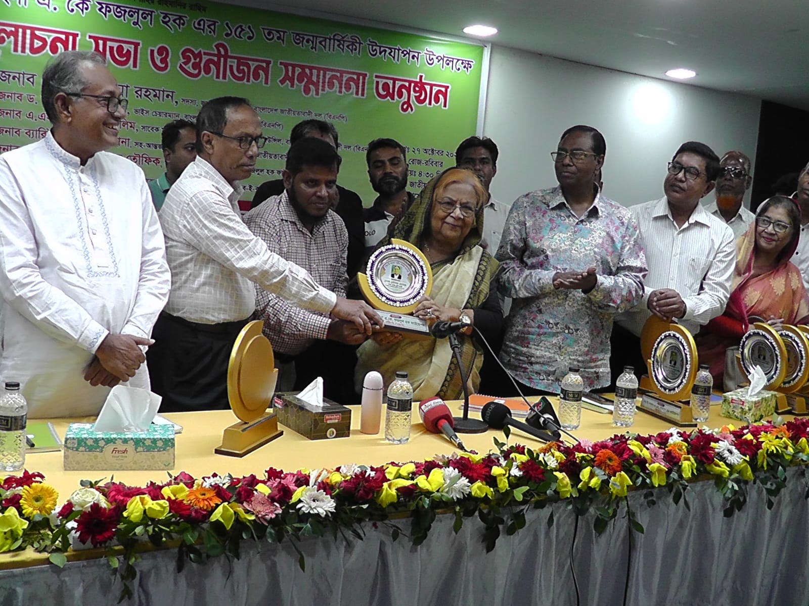 মোঃ মাহাবুব আলম স্টাফ রিপোর্টার।। অদ্য ২৭ অক্টোবর ২০২৪ খ্রি। রোজ। রবিবার বিকাল ৪.৩০ মিনিটে জাতীয় প্রেসক্লাব জহুর হোসেন চৌধুরী হলে"শের-ই-বাংলাএ.কে ফজলুল হক ফাউন্ডেশন"এর উদ্যোগে মহান নেতা শের-ই-বাংলা এ.কে.ফজলুল হকের ১৫১ তম জন্মবার্ষিকী উদযাপন উপলক্ষ্যে এক আলোচনা সভা ও গুণীজন সম্মাননা অনুষ্ঠান অনুষ্ঠিত হয়। উক্ত অনুষ্ঠানে প্রধান অতিথি হিসেবে উপস্থিত ছিলেন জনাব বেগম সেলিমা রহমান,জাতীয় স্থায়ী কমিটির সদস্য,বাংলাদেশ জাতীয়তাবাদী দল (বিএনপি) এবং বিশেষ অতিথি হিসাবে উপস্থিত ছিলেন জনাব ড.আসাদুজ্জামান রিপন ভাইস-চেয়ারম্যান,বাংলাদেশ জাতীয়তাবাদী দল (বিএনপি) জনাব এ.এস.এম.আব্দুল হালিম,সাবেক মন্ত্রী পরিষদ সচিব ও বাংলাদেশ জাতীয়তাবাদী দল (বিএনপি) এর উপদেষ্টা কাউন্সিলের সদস্য,জনাব ব্যারিষ্টার রুমিন ফারহানা,সহ-আন্তর্জাতিক বিষয়ক সম্পাদক,বাংলাদেশ জাতীয়তাবাদী দল (বিএনপি)। এছাড়াও উর্ধ্বতন কর্মকর্তা,রাজনীতিবিদ,ব্যবসায়ী ও গন্যমান্য ব্যক্তিবর্গ উপস্থিত ছিলেন। আমন্ত্রিত অতিথিবৃন্দ শের-ই-বাংলা এ.কে.ফজলুল হকের কর্মময় জীবনের স্মৃতিচারণ করে গুরুত্বপূর্ণ বক্তব্য রাখেন। উক্ত অনুষ্ঠানে সমাজের বিভিন্ন ক্ষেত্রে বিশেষ অবদানের স্বীকৃতি স্বরুপ ১৩ জন বিশিষ্ট গুনী ব্যাক্তিকে"শের-ই-বাংলা স্মৃতি পদক-২০২৪"এ ভূষিত করা হয়। জনাব মোঃ আবু হানিফ ১ ডাঃ সালাহউদ্দিন মাহমুদ মানবতাবাদী কথাসাহিত্যিক কবি এস,এম শাওয়ান মনির ২ জনাব স্বদেশ বন্ধু খান মোঃ ইলিয়াস শাহী মোখলেস জনাব মোঃ মাঈনউদ্দিন (মানিক) 3 জনাব মোঃ খোরশেদ আলম 4 জনাব মোঃ মহিউদ্দিন আহম্মেদ 5 মোহাম্মদ বিল্লাল হোসেন 6 জনাব মোঃ আবু তাহের 7 মোঃ নবীনুর রহমান নবীন 8 এডভোকেট এস এম মফিজুল ইসলাম 9 জনাব মোঃ হাজী হেলাল 10জনাব মোঃ শামসুদ্দিন মিয়া (ঝুনু)পুরুস্কার বিবরনী তরুন উদ্যোক্তা ও সফল ব্যবসায়ী বিশেষজ্ঞ চিকিৎসক কবি ও সাহিত্যিক শিক্ষাবীদ ও সমাজ সেবক বিশিষ্ট সমাজ সেবক বিশিষ্ট সমাজ সেবক বিশিষ্ট সাংবাদিক তরুন আইনজীবী বিশিষ্ট সমাজ সেবক তরুন উদ্যেক্তা বিশিষ্ট সমাজ সেবক