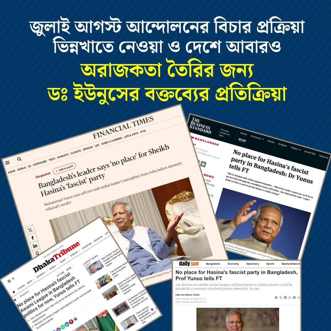জুলাই আগস্ট আন্দোলনের বিচার প্রক্রিয়া ভিন্নখাতে নেওয়া ও দেশে আবারও অরাজকতা তৈরির জন্য ডঃ ইউনুসের বক্তব্যের প্রতিক্রিয়া
