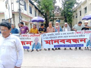 নোয়াখালীর চাটখিলে (কানা) সোলেমান ও তার পরিবারকে এলাকা থেকে অপসারণের দাবীতে মানববন্ধন।