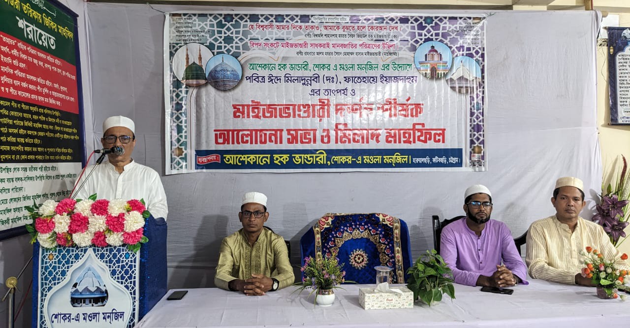 তিনি আরো বলেন,কারবালায় এজিদ বাহিনীতে সাত হাজার হাফেজ ও তিন হাজার মুফতি থাকা সত্ত্বেও তারা শহীদ করেছে হযরত ইমাম হোসাইন (রাঃ) তথা ইসলামকে। কিন্তু শহীদ করেও হোসাইনী শক্তিকে দমিয়ে রাখা যায় নি। বেলায়তী শক্তি,আহমদী শক্তি মানেই হোসাইনী শক্তি। এই হোসাইনী,আহমদী শক্তি অর্থাৎ বেলায়তের জন্য আমাদের আহলে বাইয়াতে রাসূল (দঃ) তথা মওলা হুজুর মাইজভাণ্ডারী (মঃজিঃআঃ) কেবলা কাবার প্রতি পূর্ণ আনুগত্য থাকতে হবে। মাহফিলে সংগঠনের সর্বস্তরের কর্মকর্তা,সদস্যবৃন্দ ও এলাকার গণ্যমান্য ব্যক্তিবর্গ উপস্থিত ছিলেন। মাওলানা মুহাম্মদ আবু তাহের মাইজভাণ্ডারী'র পরিচালনায় মিলাদ মাহফিলের পর প্রধান অতিথির দেশ ও মানবজাতির কল্যাণে মুনাজাতের মাধ্যমে মাহফিলের সমাপ্তি হয়।