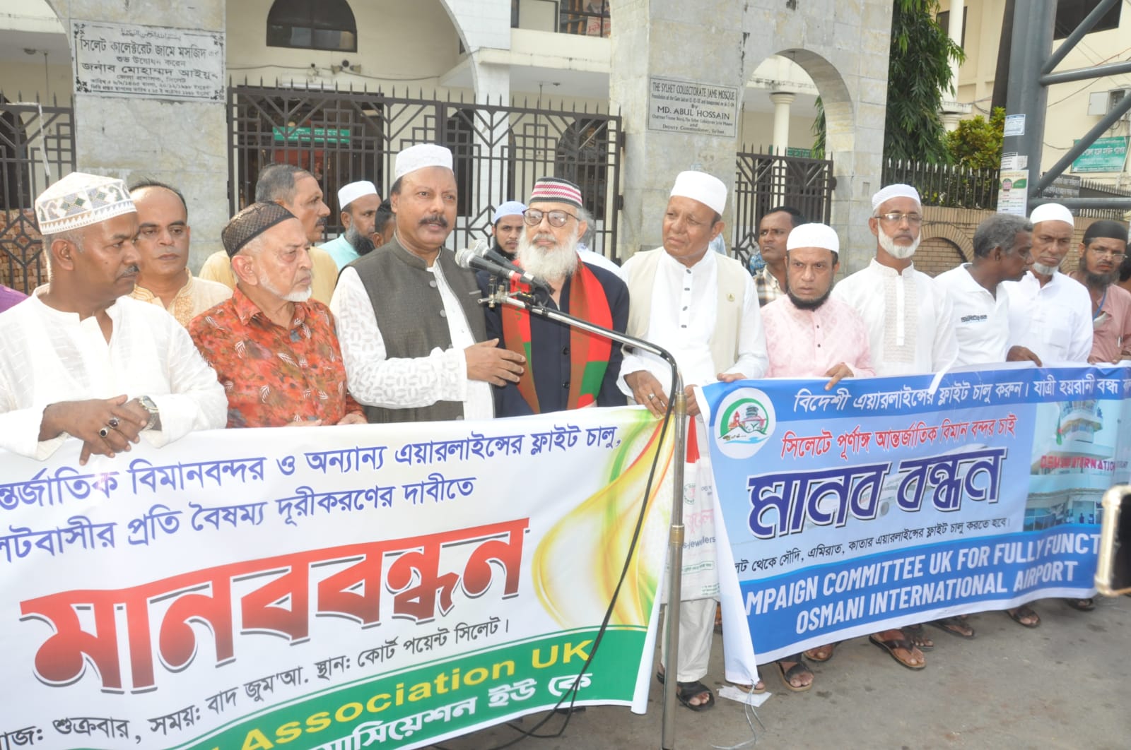 প্রবাসীদের দুর্ভোগ লাঘবে সিলেট ওসমানী বিমানবন্দরকে পূর্ণাঙ্গ রুপে পরিণত করার দাবিতে কোর্ট পয়েন্টে মানববন্ধন,, স ম জিয়াউর রহমান,চট্টগ্রাম জেলা স্টাফ রিপোর্ট।। সিলেট বিভাগের প্রবাসীদের দুর্ভোগ লাঘবে ওসমানী বিমানবন্দরকে পূর্ণাঙ্গ আন্তর্জাতিক বিমানবন্দরে পরিণত করার দাবি জানিয়েছেন সর্বস্তরের জনতা। দীর্ঘ দিনের এ দাবি বাস্তবায়নে তারা অন্তবর্তী সরকারের প্রধান উপদেষ্টার হস্তক্ষেপ কামনা করেন। ১ নভেম্বর শুক্রবার বাদ জুমা সিলেট নগরী কোর্ট পয়েন্টে আয়োজিত মানববন্ধন কর্মসূচিতে বক্তারা এসব দাবি তুলে ধরেন। সিলেট ওসমানী আন্তর্জাতিক বিমানবন্দরকে পূর্ণাঙ্গ আন্তর্জাতিক বিমানবন্দরে পরিণত এবং অন্যান্য এয়ার লাইন্সের ফ্লাইট চালুসহ বিভিন্ন দাবি জানিয়ে‘সিলটী আওয়াজ’এবং ক্যাম্পেইন কমিটি ইউকে ফর ফুল্লি ফাঙ্কশনাল ওসমানী ইন্টারন্যাশনাল এয়ারপোর্ট যৌথভাবে এই মানববন্ধন কর্মসূচির আয়োজন করে। সিলটী আওয়াজের আহবায়ক যুদ্ধাহত বীরমুক্তিযোদ্ধা এম এ মালেক খানের সভাপতিত্বে আয়োজিত মানববন্ধনে বক্তারা অভিযোগ করে বলেন,ওসমানী আন্তর্জাতিক বিমানবন্দর শুধু নামে মাত্র আন্তর্জাতিক বিমানবন্দর। পর্যাপ্ত সুযোগ সুবিধা থাকার পরও এখানে অন্যান্য দেশের ফ্লাইট উঠা-নামার ব্যবস্থা নেয়া হচ্ছেনা। ফলে,সিলেট অঞ্চলের বিদেশ যাত্রীদের চরম হয়রানীর শিকার হতে হচ্ছে। সেই সাথে সিলেট বিদ্বেষী চক্র বাংলাদেশ বিমানে ভাড়ার ক্ষেত্রে বৈষম্য সৃষ্টি করে প্রবাসী যাত্রীদের জিম্মি করে অতিরিক্ত টাকা হাতিয়ে নিচ্ছে। এ দেশের ছাত্র-জনতা যেমনি সকল বৈষম্যের বিরুদ্ধে রুখে দাঁড়িয়েছে তেমনি সিলেটবাসীকেও ন্যায্য অধিকার আদায়ে সোচ্চার হওয়ার আহবান জানান বক্তারা। সেই সাথে সিলেটের গ্যাস বাসা-বাড়ি ও প্রতিষ্ঠানে সংযোগ প্রদান,ঢাকা-চট্টগ্রামের মতো সিলেট টু আখাউড়া নতুন ডাবল রেললাইন নির্মাণ করা এবং সিলেট টু ঢাকা মহাসড়কের ৬ লেনের কাজ দ্রুত সম্পন্ন করারও দাবি জানান বক্তারা। মানববন্ধন কর্মসূচি সমর্থনে উপস্থিত ছিলেন সিলেট-চট্টগ্রাম ফ্রেন্ড শিপ ফাউন্ডেশন,কেন্দ্রীয় কমিটির উপদেষ্টা পরিষদের চেয়ারম্যান,সিলেট মেট্রোপলিটন চেম্বার অব কমার্স এন্ড ইন্ডাস্ট্রি (এসএমসি সিআই) এর পরিচালক,উইমেন্স মেডিকেল কলেজ হাসপাতাল সিলেটের পরিচালক ও সৌদিআরব প্রবাসী বিশিষ্ট ব্যবসায়ী আলহাজ্ব মোহাম্মদ কাপ্তান হোসেন এবং প্রতিষ্ঠাতা সভাপতি মোঃ শহিদুল ইসলাম ও মহাসচিব উৎফল বড়ুয়া। আলহাজ্ব মোহাম্মদ কাপ্তান হোসেন বলেন,বাংলাদেশ সরকারের প্রধান উপদেষ্টার প্রতি সম্মান ও শ্রদ্ধা রেখে বলছি অবিলম্বে প্রবাসীদের যৌক্তিক দাবি মেনে নিয়ে সিলেটবাসীকে সম্মানিত করুন। সিলটী আওয়াজের সদস্য সচিব সাংবাদিক এম এ