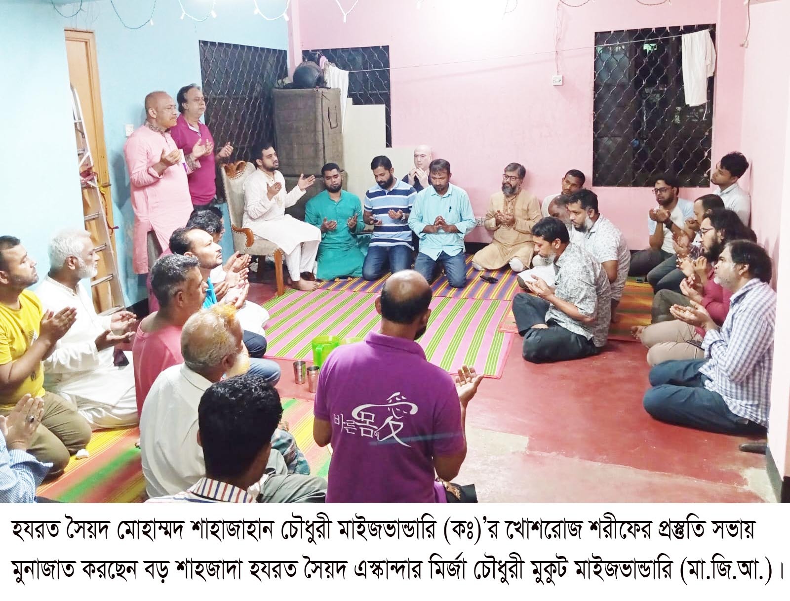 অছিয়ে গাউছুল আজম হযরত সৈয়দ দেলাওর হোসাইন মাইজভান্ডারী (ক.) কেবলা কাবার বড় দৌহিত্র, প্রথমা শাহাজাদী সৈয়দা মোবাশ্বেরা বেগম (রা.) এর জ্যৈষ্ঠ পুত্র ও বিশ্বঅলি শাহানশাহ সৈয়দ জিয়াউল হক মাইজভাণ্ডারী (ক.) কেবলা কাবার ভাগিনা,আওয়াদে রাসূল (দ.),আওলাদে গাউছুল আজম মাইজভাণ্ডারী (ক.) হাজত রাওয়া,মুস্কিল কোশা,ফানাফিল্লাহ,বাকা বিল্লাহ,শাহানশাহ হযরত শাহ্সুফি সৈয়দ মোহাম্মদ শাহজাহান চৌধুরী মাইজভাণ্ডারী (ক.) এর পবিত্র খোশরোজ শরীফ (প্রধান দিবস) ১৪ই মাঘ ২৮ জানুয়ারি ২০২৫খ্রি.ফটিকছড়ি লেলাংস্থ সন্যাসিরহাটের পশ্চিম পার্শ্বে রওজা শরীফে অনুষ্ঠিত হবে। উক্ত খোশরোজ শরীফের প্রস্তুতি সভা গতকাল ৩ নভেম্বর অনুষ্ঠিত হয়। মহতি এ সভায় সভাপতিত্ব করেন গাউসিয়া শাহাজাহান মঞ্জিলের বড় শাহজাদা হযরত সৈয়দ এস্কান্দার মির্জা চৌধুরী মুকুট মাইজভান্ডারি (মা.জি.আ.)। এতে উপস্থিত ছিলেন ছোট শাহজাদা হযরত সৈয়দ মোহাম্মদ সেকান্দর মির্জা চৌধুরী মহান মাইজভান্ডারি (মাঃ জিঃ আঃ)। সভায় দেশের প্রত্যান্ত অঞ্চল থেকে শাখা কমিটি,ইউনিট কমিটি,নগর আহ্বায়ক কমিটি,মাজার পরিচালনা কমিটির সকল কর্মকর্তার উপস্থিতির মাধ্যমে ব্যাপক প্রস্তুতি গ্রহণ করা হয়।