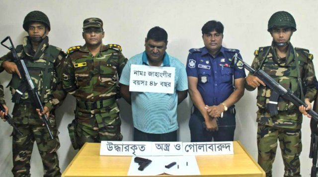 পটুয়াখালীর মির্জাগঞ্জে বিদেশি পিস্তল ও গুলিসহ বিএনপি নেতা মো.জাহাঙ্গীর ফরাজিকে আটক করেছে যৌথ বাহিনী। আজ ৭ নভেম্বর ভোরে মির্জাগঞ্জ উপজেলার উত্তর সুবিদখালী এলাকার নিজ বাসা থেকে তাকে আটক করা হয়। আটক জাহাঙ্গীর ফরাজি মির্জাগঞ্জ উপজেলা বিএনপির সাধারণ সম্পাদক ও মৃত মোতালেব ফরাজির ছেলে। আটকের বিষয়টি নিশ্চিত করে সেনা কর্মকর্তা ক্যাপ্টেন রিমান রাফিন নিশাত বলেন,গোয়েন্দা তথ্যের ভিত্তিতে অভিযান চালিয়ে জাহাঙ্গীর ফরাজির বাড়ি তল্লাশি করা হয়। এ সময় বাড়ির দুটি ভিন্ন কক্ষে লুকিয়ে রাখা যুক্তরাষ্ট্রের তৈরি একটি অত্যাধুনিক ৭.৬৫ এমএম পিস্তল,একটি ম্যাগাজিন ও দুই রাউন্ড গুলি উদ্ধার করা হয়। অস্ত্র উদ্ধারের পরে তাকে আটক করা হয়েছে এবং তার বিরুদ্ধে পরবর্তী আইনি পদক্ষেপ নেওয়া হচ্ছে। মির্জাগঞ্জ থানার ভারপ্রাপ্ত কর্মকর্তা (ওসি) শামীম হাওলাদার বলেন,বিএনপি নেতা জাহাঙ্গীর ফরাজিকে আটক করা হয়েছে। তার বিরুদ্ধে অস্ত্র আইনে মামলা দায়েরের প্রস্তুতি চলছে।
