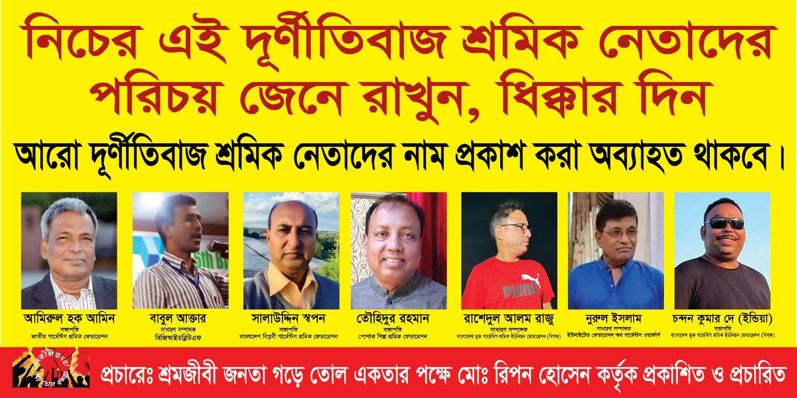 মোঃ মাহাবুব আলম,রিপোর্টার।। প্রিয় শ্রমজীবী ভাই ও বোনেরা ২০২৩ সনের নভেম্বরে গার্মেন্টস শ্রমিকদের মজুরী বৃদ্ধির আন্দোলনকারীদের রাজপথে রেখে আ মনেইবিসির পাঁচ পান্ডব এবং বরও কিছু সহযোগী মালিক সমিতির সিদ্দিকুর রহমানের কাছ থেকে ঘুষ নিয়ে বিদেশে পালিয়ে যায়। ৬ নভেম্বর মন্নুজানের বাসায় নূরুলইসলাম এবং আরও কয়েকজন ঘুষ নিয়ে ১২,৫০০/- টাকা মজুরী ঘোষণা দেয়। পরবর্তীতে মজুরী আন্দোলনে ৪ জন শ্রমিকের মৃত্যু হয়। এই বিশ্বাসঘাতক শ্রমিক নেতাদের চিহ্নিত করার জন ৭ নভেম্বরে দিনটিকে কালো দিবস ঘোষণা করা হয়েছে। কালো দিবস উপলক্ষে আজ ৮ নভেম্বর বিকাল ৪.০০ ঘটিকায় জাতীয় প্রেসক্লাবের সামনে প্রতিবাদ সমাবেশ অনুষ্ঠিত হয়।