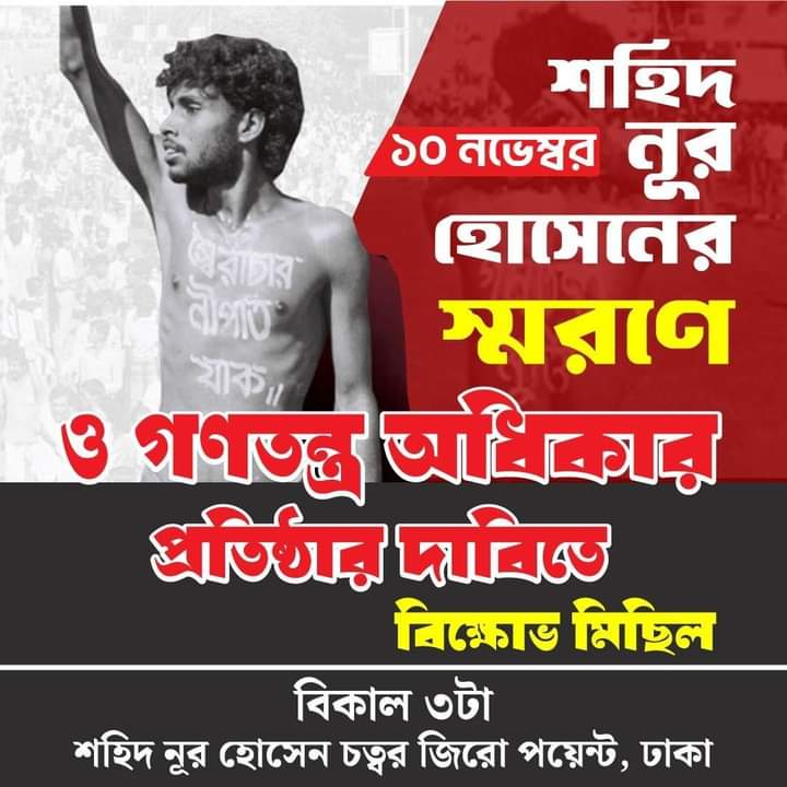 ১০ নভেম্বর শহিদ নূর হোসেনের স্মরণে ও গণতন্ত্র অধিকার প্রতিষ্ঠার দাবিতে বিক্ষোভ মিছিল