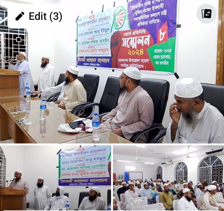 মাওলানা আবু ইউসুফ।।ভোলা চরফ্যাশনে ইসলামী আন্দোলন বাংলাদেশ এর ওয়ার্ড প্রতিনিধি সম্মেলন ২০২৪ অনুষ্ঠিত ভোলা জেলা দক্ষিণ শাখা কর্তৃক চরফ্যাশন পৌরশাখা ইসলামী আন্দোলন বাংলাদেশের ওয়ার্ড প্রতিনিধি সম্মেলন ২০২৪ অনুষ্ঠিত হয়েছে।ওয়ার্ড প্রতিনিধি সম্মেলন অনুষ্ঠানটি অনুষ্ঠিত হয়েছে শুক্রবার (৮ নবেম্বর ২০২৪) বিকেলে ভোলা জেলার চরফ্যাশন উপজেলার মডেল মসজিদ অডিটোরিয়াম। চরফ্যাশন পৌর শাখা কর্তৃক ইসলামী আন্দোলন বাংলাদেশের ওয়ার্ড প্রতিনিধি সম্মেলন অনুষ্ঠিত হয়েছে।এসময় ওয়ার্ড প্রতিনিধি সম্মেলনটি পরিচালনা করেন হাফেজ মাওলানা মুফতি ফয়জুল্লালহ সেক্রেটারি ইসলামি আন্দোলন বাংলাদেশ চরফ্যাশন পৌর শাখা ।ওয়ার্ড প্রতিনিধি সম্মেলন প্রধান অতিথি হিসেবে উপস্থিত ছিলেনঃ আলহাজ্ব আলাউদ্দিন তালুকদার সভাপতি ভোলা জেলা দক্ষিণ ইসলামি আন্দোলন বাংলাদেশ ভোলা জেলা দক্ষিণ। বিশেষ অতিথি হিসেবে উপস্থিত ছিলেন মাওলানা মোহাম্মদ আবু ইউসুফ সাধারণ সম্পাদক ভোলা জেলা দক্ষিণ ইসলামি আন্দোলন বাংলাদেশ ভোলা জেলা দক্ষিণ। অর্থ ও প্রকাশনা সম্পাদক ভোলা জেলা দক্ষিণ ইসলামি আন্দোলন বাংলাদেশ। ওয়ার্ড প্রতিনিধি সম্মেলনটি সভাপতিত্ব করেন ডা.মোহাম্মদ শাফিফ হোসাইন সিনিয়র সহ সভাপতি ইসলামি আন্দোলন বাংলাদেশ চরফ্যাশন পৌর শাখা। ইসলামি আন্দোলন বাংলাদেশ চরফ্যাশন উপজেলা শাখা সহ জেলা ও থানা নেতৃবৃন্দ।বক্তারা বলেন,বিগত ১৬ বছরে যারা দেশকে অর্থনৈতিকভাবে ভঙ্গুর করে দিয়ে, দেশের টাকা বিদেশে পাচার করে দেশকে দেউলিয়া করে ফেলেছে। শেখ হাসিনা প্রধানমন্ত্রী থাকার জন্য বাংলাদেশে সব রাষ্ট্রীয় ব্যবস্থাপনাকে ধ্বংস করে দিয়েছেন। বক্তারা আরও বলেন,ছাত্র-জনতার গণ অভ্যুত্থানে সংগঠিত গণহত্যার বিচার,দূর্নীতিবাজদের গ্রেফতার,অবৈধ সম্পদ বাজেয়াপ্ত ও নির্বাচনে অযোগ্য ঘোষণা সহ রাষ্ট্রের সকর বৈষম্য দূর করে ইসলামী রাষ্ট্র প্রতিষ্ঠা করে একটি কল্যাণ রাষ্ট্র গড়ে তুলতে হবে। এসময় শতশত ইসলামী আন্দোলন এর সমর্থক সহ প্রিন্ট ও ইলেকট্রনিক মিডিয়ায় কর্মরত সাংবাদিকবৃন্দ উপস্থিত ছিলেন।