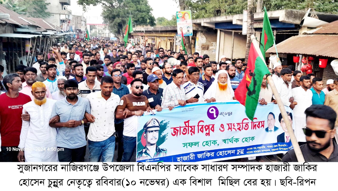 হাজরী জাকির হোসেন চুন্নুর নেতৃত্বে নাজিরগঞ্জে বিএনপির বিশাল মিছিল