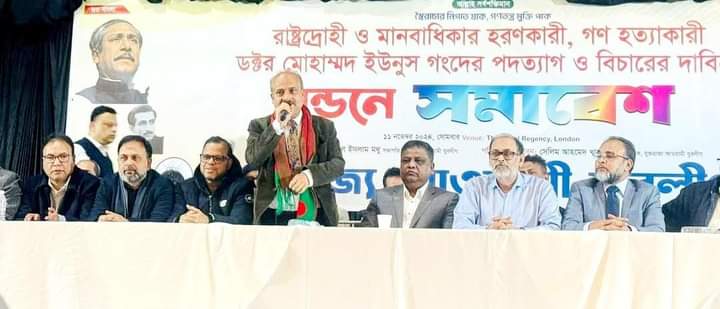ড.ইউনুস গংদের পদত্যাগের দাবিতে ও যুবলীগের ৫২তম প্রতিষ্ঠা বার্ষিকীতে লন্ডনে যুবলীগের সমাবেশ অনুষ্ঠিত ও যুক্তরাজ্যের লন্ডনে বাংলাদেশ আওয়ামী যুবলীগের উদ্যোগে যুবলীগের ৫২তম প্রতিষ্ঠা বার্ষিকী উদযাপন ও রাষ্ট্রদ্রোহী,মানবাধিকার হরন কারী,গণহত্যা কারী বাংলাদেশের বর্তমান অন্তর্বর্তী সরকারের প্রধান উপদেষ্টা ড.মুহাম্মদ ইউনুস ও তাঁর পরিষদের উপদেষ্টাদের পদত্যাগ ও বিচারের দাবিতে গত ১১ নভেম্বর সোমবার সন্ধ্যায় লন্ডনের কমিউনিটি সেন্টারে এক সমাবেশ অনুষ্ঠিত হয়েছে। যুক্তরাজ্য আওয়ামী যুবলীগের সভাপতি ফখরুল ইসলাম মধুর সভাপতিত্বে ও সাধারণ সম্পাদক সেলিম আহমেদ খান ও যুগ্ম সম্পাদক জামাল খানের যৌথ সঞ্চালনায় অনুষ্ঠিত সমাবেশে প্রধান অতিথি ছিলেন যুক্তরাজ্য আওয়ামী লীগের সভাপতি সুলতান মাহমুদ শরীফ। প্রধান বক্তা ছিলেন সিলেট সিটি করপোরেশনের (সিসিক) সাবেক মেয়র ও যুক্তরাজ্য আওয়ামী লীগের যুগ্ম সম্পাদক আনোয়ারুজ্জান চৌধুরী।