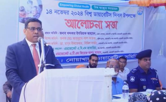 নোয়াখালীত বিশ্ব ডায়াবেটিকস দিবসের শুভ উদ্বোধন, শো়ভাযাত্রা ও আলোচনা সভা অনুষ্ঠিত হয়। বৃহস্পতিবার ১৪ নভেম্বর সকাল ৯টায় নোয়াখালী ডায়াবেটিক সমিতির সামনে থেকে সরকারি ও বেসরকারি বিভিন্ন দপ্তরের কর্মকর্তা,ডায়াবেটিক রোগীসহ নানা শ্রেণী পেশার প্রতিনিধিদের অংশগ্রহণে জেলা শহরে বর্ণাঢ্য শোভাযাত্রা বের করা হয়। আগামীতে নিজেকে সুরক্ষায় ডায়াবেটিকস কে জানুন'এ শ্লোগানে নোয়াখালী ডায়াবেটিক সমিতির উদ্যোগে দিনব্যাপী নানা আয়োজনের মধ্য দিয়ে বিশ্ব ডায়াবেটিক দিবস পালিত হচ্ছে। এর আগে সমিতির সহ সাধারণ সম্পাদক অ্যাডভোকেট ফিরোজ আলম আজাদের সঞ্চালনায় সভাপতিত্ব করেন,নোয়াখালী ডায়াবেটিক সমিতির সাধারণ সম্পাদক অ্যাডভোকেট এবিএম জাকারিয়া। আলোচনা সভায় প্রধান অতিথি হিসেবে উপস্থিত ছিলেন,নোয়াখালী ডায়াবেটিক সমিতির সভাপতি ও নোয়াখালী জেলা প্রশাসক খন্দকার ইসতিয়াক আহমেদ। বিশেষ অতিথি হিসেবে উপস্থিত ছিলেন,সমিতির সহ-সভাপতি ও নোয়াখালী জেলা পুলিশ সুপার (এসপি) মোঃ আব্দুল্লাহ্-আল-ফারুক,অধ্যক্ষ প্রফেসর কাজী মুহাম্মদ রফিক উল্লাহ,নোয়াখালী ডায়াবেটিক সমিতির ট্রেজারার অ্যাডভোকেট আবদুল কাদির প্রমুখ।