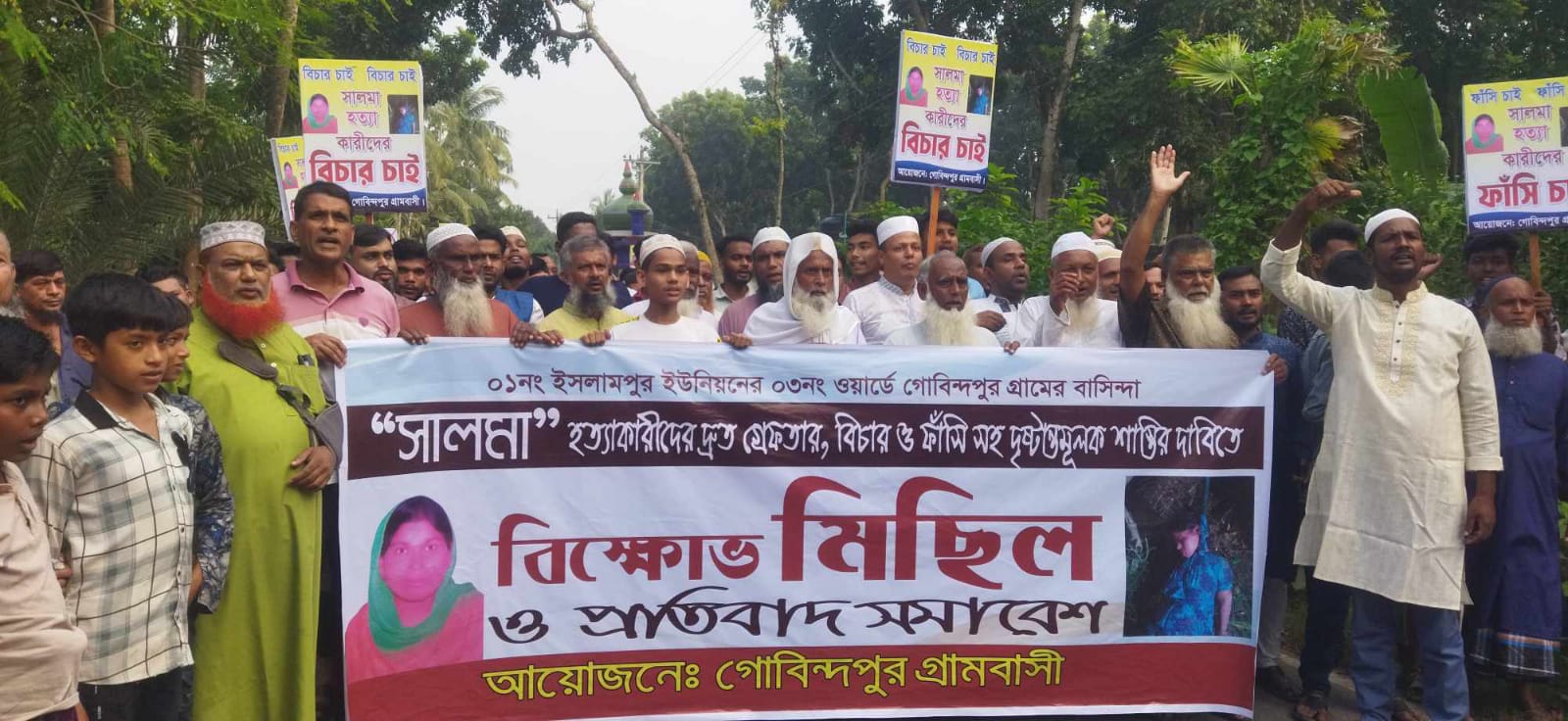 এসময় বক্তৃতা করেন,জাহাঙ্গীর আলম,মোঃ আবুল কালাম আজাদ,মনিরুল ইসলাম মনির,আঃ রহিম মন্ডল প্রমুখ। পরে মসজিদ প্রাঙ্গণে সালমা হত্যার প্রতিবাদ ও মাদকের বিরুদ্ধে সমাবেশ অনুষ্ঠিত হয়। বক্তারা বলেন বর্তমানে এলাকায় মাদক ব্যবসায়ী ও সেবনকারীদের আনাগোনা বেড়েছে। যার কারণে এলাকায় নানা অপকর্ম হচ্ছে। গত ১ নভেম্বর রাতে স্বামী পরিত্যাক্তা অসহায় সালমা আক্তারকে নির্মমভাবে হত্যা করে লেবু গাছের সাথে ঝুলিয়ে রাখা হয়েছে। আজ পর্যন্ত এই হত্যাকান্ডের কোন রহস্য উদঘাটন করতে পারেনি প্রশাসন। ফলে আজ মানববন্ধন ও বিক্ষোভ করছেন। আশা করছেন দ্রুত সময়ের মধ্যে প্রশাসন এই হত্যাকান্ডের রহস্য উদঘাটনসহ ঘটনার সাথে জরিত ও মাদক ব্যবসায়ীদের গ্রেপ্তার করবে। উল্লেখ্য,গত ১ নভেম্বর রাতে গোবিন্দপুর গ্রামের সায়েল উদ্দিনের লেবু বাগান থেকে গলায় ওড়না পেচানো অবস্থায় সৈয়দ আলী মন্ডলের মেয়ে সালমা আক্তার (৩৫) এর মরদেহ উদ্ধার করে বালিয়াকান্দি থানা পুলিশ। এ ঘটনায় অজ্ঞাতনামা আসামী করে সৈয়দ আলী মন্ডল বাদী হয়ে বালিয়াকান্দি থানায় হত্যা মামলা দায়ের করেন।