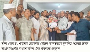 চট্টগ্রাম সিটি কর্পোরেশনের মেয়র ডা.শাহাদাত হোসেন বলেন,চট্টগ্রাম একটি বাণিজ্যিক ও গুরুত্বপূর্ণ নগরী। চট্টগ্রামের উন্নয়ন মানে বাংলাদেশের উন্নয়ন। বৃহত্তর বন্দরনগরী চট্টগ্রামকে একটি আধুনিক,নান্দনিক ও তিলোত্তমা নগরীতে পরিণত করতে চট্টগ্রামের সর্বস্তরের মানুষের পাশাপাশি সকল সিএনজি চালক-মালিকদেরও এগিয়ে আসতে হবে। তিনি আরো বলেন,বন্দরনগরী চট্টগ্রামের সড়কে শৃঙ্খলা ফিরিয়ে আনতে অবৈধ অটোরিক্সা,গ্রাম সিএনজি,নাম্বারবিহীন ও ফিটনেসবিহীন সিএনজি চলতে দেওয়া হবে না। চট্টগ্রাম সিএনজি সাধারণ মালিক ঐক্য পরিষদের সভাপতি মোহাম্মদ মহিউদ্দিন কোম্পানী ও সাধারণ সম্পাদক ইঞ্জিনিয়ার মোহাম্মদ সানাউল্লাহর নেতৃত্বে আজ (১৭ নভেম্বর) রোববার সকাল ১১টায় নগরীর বাদশা মিয়া সড়কস্থ বাসভবনে চট্টগ্রাম সিটি কর্পোরেশনের মেয়র ও চট্টগ্রাম মহানগর বিএনপি’র সাবেক সভাপতি ডা.শাহাদাত হোসেনের সাথে এক সৌজন্যে সাক্ষাৎ ও মতবিনিময়ে মিলিত হয়। সাক্ষাৎকালে এসময় উপস্থিত ছিলেন সংগঠনের কর্মকর্তা মোহাম্মদ ইদ্রিস কোম্পানী,মোহাম্মদ মাহফুজ,নয়ন কোম্পানী,মোহাম্মদ সালাউদ্দিন,মোহাম্মদ আবদুস সালাম,শাহ আলম,আলতাফ হোসেন,মুন্সি মিয়া,মোহাম্মদ খায়রুল কোম্পানী,মোহাম্মদ হেলাল, মোহাম্মদ রাজ্জাক,মোহাম্মদ আলমগীর,মোহাম্মদ সগীর, মোহাম্মদ এনায়েত হোসেন আরজু,মোহাম্মদ জিল্লুর, মোহাম্মদ রুবেল,মোহাম্মদ হানিফ কোম্পনী,মোহাম্মদ সোলায়মান,মোহাম্মদ ইমাম হোসেন,মোহাম্মদ আলী হোসেন,মোহাম্মদ ফারুক কোম্পানী,মো.মামুনুর রশীদ প্রমূখ। এসময় ডা.শাহাদাত হোসেন আরো বলেন, চট্টগ্রাম আমার আপনার সকলের শহর। চট্টগ্রামকে নান্দনিক ও তিলোত্তমা নগরীতে পরিণত করতে নগরীর সকল নাগরিকের সমান দায়িত্ব রয়েছে। তিনি সকলকে সচেতন নাগরিক হিসেবে চট্টগ্রামকে তিলোত্তমা নগরীতে পরিণত করতে এগিয়ে আসার আহ্বান জানান।