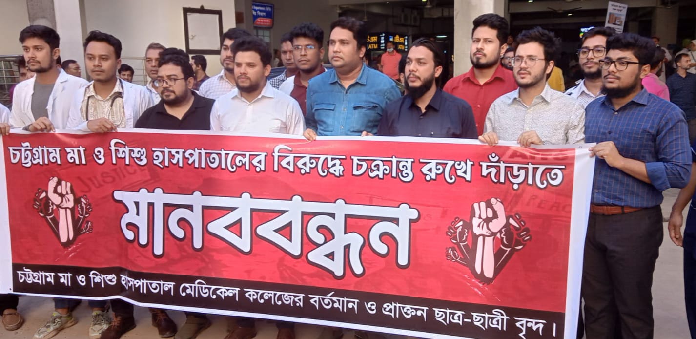 চট্টগ্রাম মা ও শিশু হাসপাতালের বিরুদ্ধে ষড়যন্ত্র ও অপপ্রচার বন্ধের দাবিতে মানববন্ধন
