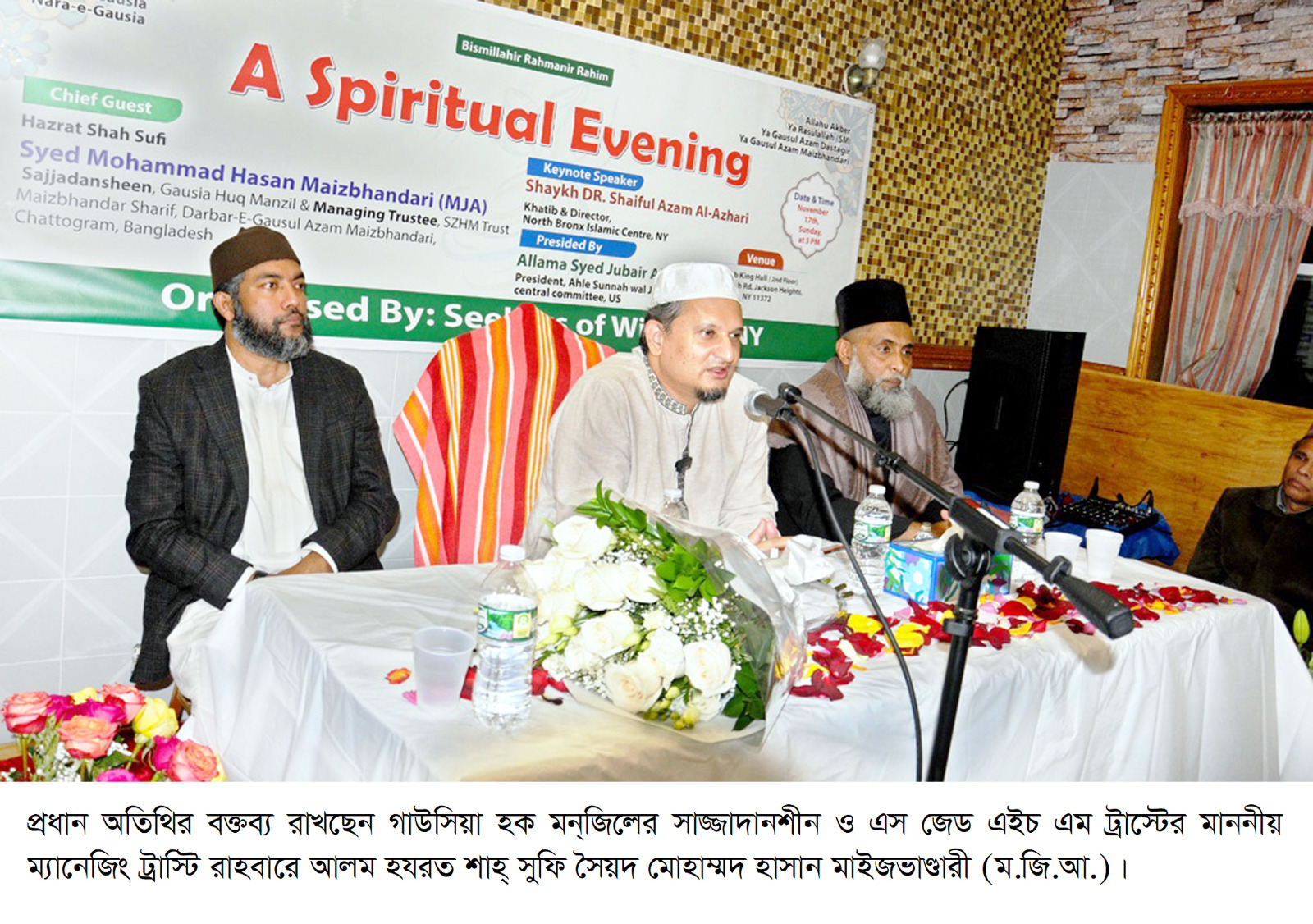 স ম জিয়াউর রহমান,স্টাফ সমগ্র বাংলাদেশ।।:গত ১৭ নভেম্বর রবিবার যুক্তরাষ্ট্রের নিউইয়র্কের জ্যাকসন হাইটস-এ অবস্থিত কাবাব কিং হলে 'Seekers of Wisdom' সংগঠনের ব্যবস্থাপনায় 'A Spiritual Evening' শিরোনামে আলোচনা সভা অনুষ্ঠিত হয়। নিউইয়র্ক স্ট্যাট পুলিশ অফিসার কে. এম. হাসনাতের পরিচালনায় ও আল্লামা জুবায়ের আহমদের সভাপতিত্বে অনুষ্ঠানে প্রধান অতিথি ছিলেন দরবার-ই-গাউসুল আযম মাইজভাণ্ডারীর গাউসিয়া হক মন্জিলের সাজ্জাদানশীন ও এস জেড এইচ এম ট্রাস্টের মাননীয় ম্যানেজিং ট্রাস্টি রাহবারে আলম হযরত শাহ্ সুফি সৈয়দ মোহাম্মদ হাসান মাইজভাণ্ডারী (ম.জি.আ.)।