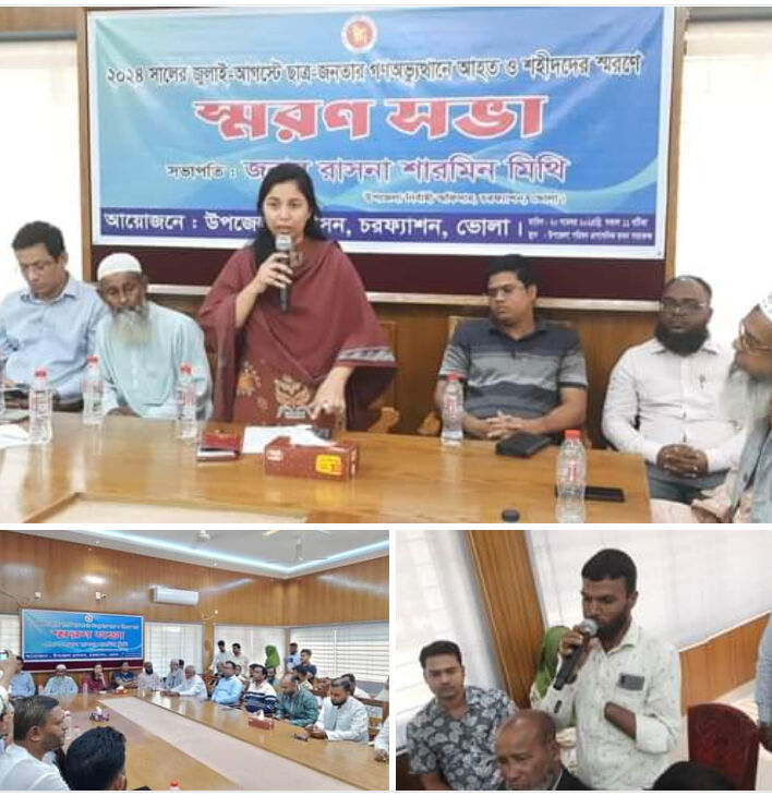 ২০২৪ সালে জুলাই-আগস্ট ছাত্র জনতার গণঅভ্যুত্থানে আহত ও নিহত শহীদদের স্মরণে'স্মরণ সভা'চরফ্যাশন উপজেলা পরিষদের হলরুমে ২০ নভেম্বর বুধবার সকাল ১১টায় অনুষ্ঠিত হয়েছে চরফ্যাশন উপজেলা নির্বাহী কর্মকর্তা রাসনা শারমিন মিথির সভাপতিত্বে স্মরণ সভায় বক্তব্য রাখেন বাংলাদেশ জামায়াতে ইসলামী ভোলা জেলার সেক্রেটারি কাজী মাওলানা মোঃ হরুন অর রশিদ,উপজেলা বিএনপির সাবেক সাধারণ সম্পাদক মোতাহার হোসেন আলমগীর মালতিয়া,সহকারী পুলিশ সুপার মোহেদী হাসান,উপজেলা সহকারী কমিশনার (ভূমি) আবুল হাসনাত,উপজেলা স্বাস্থ্য পরিবার ও পরিকল্পনা কর্মকর্তা ডা:শোভন বসাক,উপজেলা বিএনপি নেতা মমিনুল ইসলাম ভুট্রো,গণঅধিকারের নেতা এইচ টি মাসুদ চৌধুরী,ইসলামী আন্দোলনের উপজেলা সভাপতি মো:আলাউদ্দিন,জুলাই আগষ্ট গণঅভ্যুত্থানে হাত হারানো জীবন্ত শহীদ নুর হোসেন,ছাত্র সমন্বয়কদের পক্ষে তামিম রহমান রহমান ও বিএনপি নেতা কওসার আহমেদ প্রমুখ। অন্যদের মধ্যে,উপজেলা মাধ্যমিক শিক্ষা কর্মকর্ত মো. মহিউদ্দিন,জামায়াতে ইসলামী ভোলা জেলার সাবেক আমীর ও বরিশাল অঞ্চল টিমের সদস্য অধ্যক্ষ মাওলানা মোস্তফা কামাল,চরফ্যাশন উপজেলা জামায়াতের আমীর অধ্যক্ষ মীর মোহাম্মদ শরীফ হোসাইন,উপজেলা যুবদলের সাবেক সভাপতি আশ্রাফুর রহমান দিপু ফরাজি,চরফ্যাশন প্রেসক্লাবের সাধারণ সম্পাদক ও সাবেক যুবদলের সাধারণ সম্পাদক শহিদুল ইসলাম দুলাল,পৌর যুবদলের সাবেক সভাপতি রিয়াজ সিকদারসহ বিভিন্ন রাজনৈতিক দলের নেতৃবৃন্দ,শহীদ ও আহতদের পরিবার,সংবাদ কর্মীসহ বিভিন্ন পেশার লোকজন উপস্থিত ছিলেন।