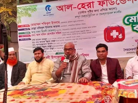 নরসিংদীর মনোহরদীতে ফ্রি মেডিকেল ক্যাম্প অনুষ্ঠিত হয়েছে। শনিবার(২৩ নভেম্বর) মনোহরদী উপজেলা৬ সেচ্ছাসেবী পরিষদ এর আয়োজনে উপজেলার হাতিরদিয়া সৈয়দেরগাঁও গ্রামে প্রতিষ্ঠিত সেচ্ছাসেবী সংগঠন আল-হেরা ফাউন্ডেশনের কার্যালয় চত্বরে ফ্রি মেডিকেল ক্যাম্প অনুষ্ঠিত হয়। উক্ত মেডিকেল ক্যাম্পে প্রধান অতিথি হিসেবে উপস্থিত ছিলেন,কুরআন সুন্নাহ্ ফাউন্ডেশন এর চেয়ারম্যান ও মনোহরদী উপজেলা প্রেসক্লাবের অর্থ বিষয়ক সম্পাদক,মোহাম্মদ শফিকুল ইসলাম। একদুয়ারিয়া ইউনিয়ন পরিষদের চেয়ারম্যান মোল্লা রফিকুল ইসলাম ফারুক এর সভাপতিত্বে উদ্বোধক হিসেবে উপস্থিত ছিলেন,সৈয়দেরগাঁও মোল্লা বাড়ী বায়তুল আহকাম জামে মসজিদ পরিচালনা কমিটির সভাপতি,আবু বকর ছিবলী(মারুফ)। মনোহরদী উপজেলা সেচ্ছাসেবী পরিষদ এর পরিচালক সদস্য ও আবাবিল যুব সংঘের প্রতিষ্ঠাতা পরিচালক,মো.আল-মমিন হোসাইন সচিব এর পৃষ্ঠপোষকতায়,আল-হেরা ফাউন্ডেশন এর প্রতিষ্ঠাতা সভাপতি মাহমুদুল হাসান লিমন এর সার্বিক তত্বাবধানে