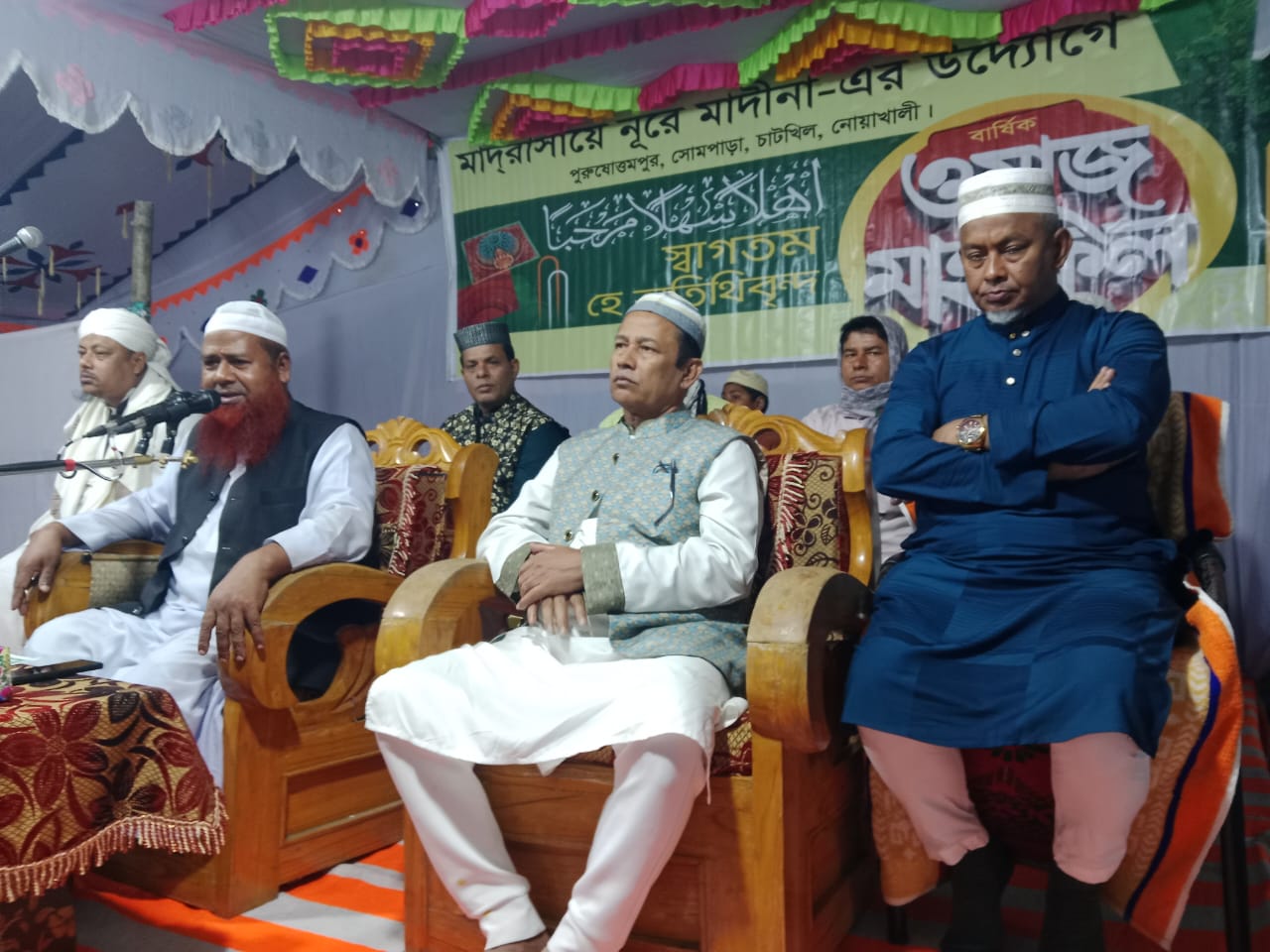 নোয়াখালীর চাটখিল উপজেলার সাহাপুর ইউনিয়ন এর সোমপাড়ার পুরুষোত্তমপুরে অবস্থিত মাদ্রাসায়ে নূরে মদীনার উদ্দ্যোগে গত ২৪ নভেম্বর এক বিশাল ওয়াজ ও দোয়ার মাহফিল এর আয়োজন করা হয়েছে। শত-শত মুসুল্লির উপস্থিতিতে,বিশিষ্ট ব্যাবসায়ী ও সমাজ সেবক জহির উদ্দিন বাবর এর সভাপতিত্বে,তাফসির ফেস করেন বিশিষ্ট ইসলামী চিন্তাবিদ হাফেজ মাওলানা সালাউদ্দিন নয়নপুরী,আরো তাফসির ফেস করেন হযরত মাওলানা রাশেদুল ইসলাম রহমতপুরী,হাফেজ মাওলানা ইউসুফ, মাওলানা জিহাদুল ইসলাম জাহাঙ্গীর সহ অনন্য ওলামাগন। উক্ত ওয়াজ ও দোয়ার মাহফিলে প্রধান অতিথি হিসেবে উপস্থিত ছিলেন ১নং শাহাপুর ইউনিয়ন পরিষদের চেয়ারম্যান আব্দুল্লাহ খোকন,বিশেষ অতিথি হিসেবে উপস্থিত ছিলেন অত্র মাদ্রাসার সাধারণ সম্পাদক হাজ্বী আব্দুস সাওার,প্রতিষ্ঠাতা সভাপতি শাহাজাহান তালুকদার,অত্র মাদ্রাসার সহ-সভাপতি মোঃ মনিরুল আলম চৌধুরী,বিশিষ্ট সমাজ সেবক মোঃ শাহ্ জামাল, বিশিষ্ট সমাজ সেবক ফিরোজ আলম বাবলু, বিশিষ্ট সমাজ সেবক মোরশেদ আলম সহ বিভিন্ন সমাজসেকগন। উক্ত ওয়াজ ও দোয়ার মাহফিলে উপস্থাপনা করেন ইউসুফ আল মহাম্মদ,সার্বিক তত্বাবধানে ছিলেন অত্র মাদ্রাসার মুহতামিম হযরত মাওলানা ইউনুস আহম্মেদ।