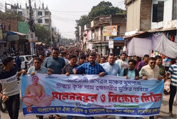 সাতক্ষীরায় চিন্ময় দাসের মুক্তির দাবিতে বিক্ষোভ মিছিল ও মানববন্ধন