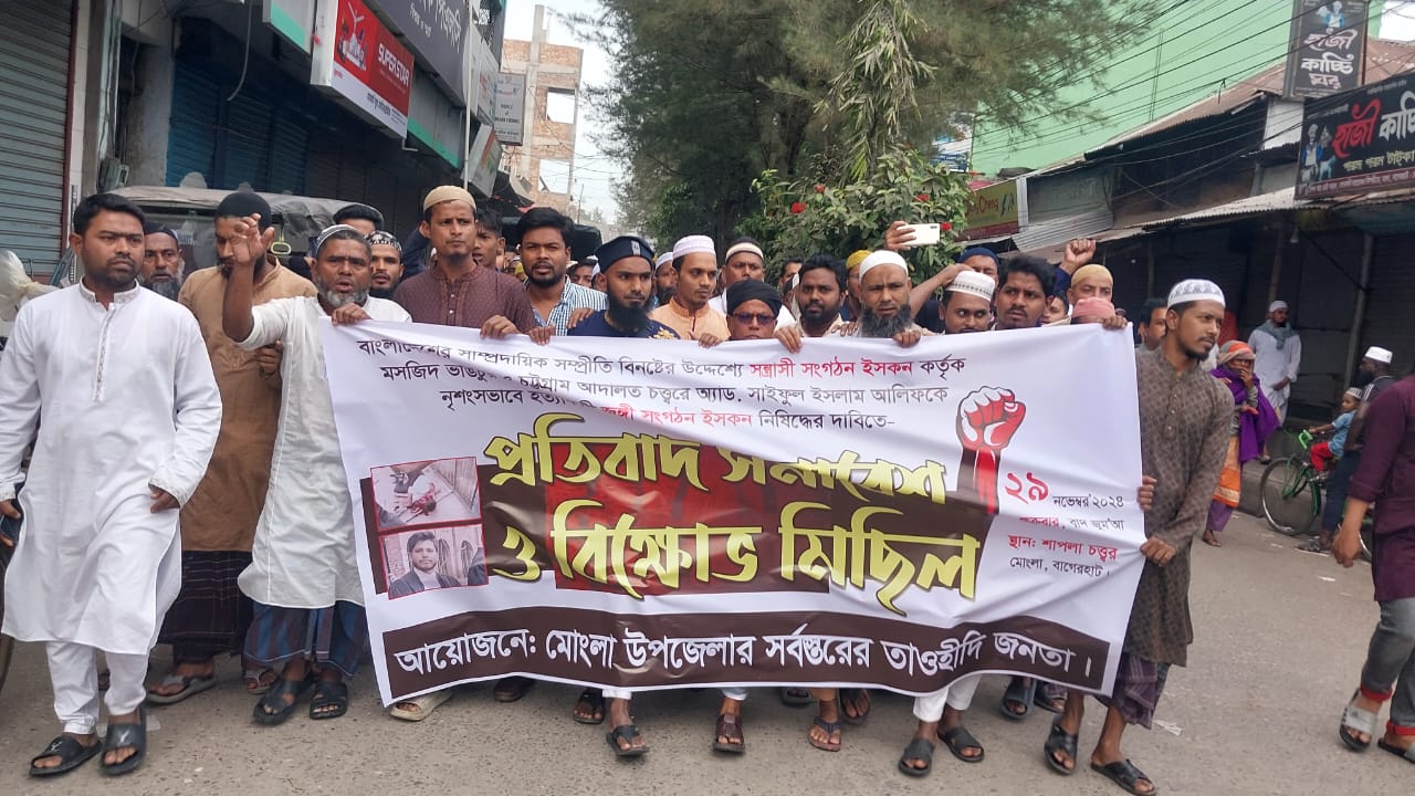 সাম্প্রদায়িক সম্প্রীতি বিনষ্টের উদ্দেশ্যে ইসকন কর্তৃক মসজিদ ভাঙচুর ও চট্টগ্রাম আদালত চত্ত্বরে আইনজীবী সাইফুল ইসলাম আলিফকে হত্যার প্রতিবাদে সমাবেশ ও বিক্ষোভ মিছিল হয়েছে। এ সময় ইসকনের সব কার্যক্রম নিষিদ্ধ করার দাবি করেন বক্তারা। শুক্রবার(২৯ নভেম্বর) জুমা বাদ মোংলা উপজেলার সর্বস্তরের তাওহিদী জনতার ব্যানারে উপজেলার বাজার জামে মসজিদের সামনে থেকে ইসকনের কার্যক্রম নিষিদ্ধের দাবিতে বিক্ষোভ মিছিলটি বের হয়। পরে বিভিন্ন মসজিদ থেকে খন্ড খন্ড মিছিল নিয়ে বাজারের প্রধান প্রধান সড়ক প্রদক্ষিণ শেষে শাপলা চত্বর এসে প্রতিবাদ সমাবেশ ও মানববন্ধনে মিলিত হয়।
