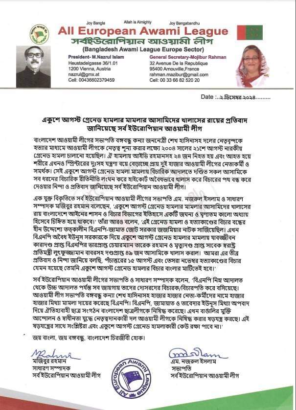 একুশে আগস্ট গ্রেনেড হামলার মামলার আসামিদের খালাসের রায়ের তীব্র নিন্দা ও প্রতিবাদ জানিয়েছে সর্ব ইউরোপিয়ান আওয়ামী লীগ