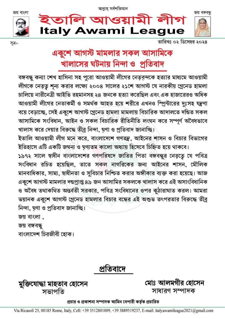 একুশে আগস্ট মামলার সকল আসামিকে খালাসের ঘটনায় ইতালী আওয়ামী লীগের নিন্দা ও প্রতিবাদ