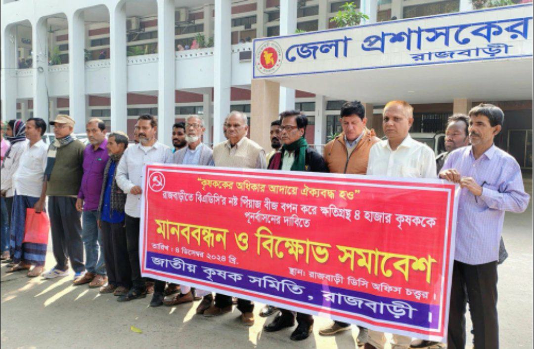 রাজবাড়ীতে কৃষি উন্নয়ন করপোরেশন (বিএডিসি) নষ্ট পেঁয়াজ বীজের কারণে ক্ষতিগ্রস্ত ৪ হাজার কৃষককে পুনর্বাসনের দাবিতে মানবববন্ধন ও বিক্ষোভ অনুষ্ঠিত হয়েছে। বুধবার বেলা ১১টার দিকে জেলা প্রশাসক কার্যালয়ের সামনে জাতীয় কৃষক সমিতির রাজবাড়ী জেলা শাখার আয়োজনে এই কর্মসূচি অনুষ্ঠিত হয়।