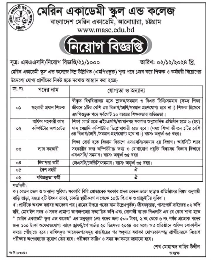 চট্টগ্রাম প্রতিনিধি আহমদ রেজা :- (এমপিও ভুক্ত) শূন্য পদে বাংলাদেশ মেরিন একাডেমির স্কুল এন্ড কলেজের নতুন শিক্ষক ও কর্মচারী নিয়োগ বিজ্ঞপ্তি অর্ধ/২১/১০০০ / সূত্র,বর্তমান নতুন কর্মসূচী অনুযায়ী ২/১২/২৪ এর বিজ্ঞপ্তি অনুসারে কিছু শূন্য পদে নিশোগ (ক)১ জন সহকারী প্রধান শিক্ষাক - স্বীকৃত বিশ্ববিদ্যালয় হতে স্নাতক। সমমান ও বিএড ডিগ্রী/সমমান (সমগ্র শিক্ষা জীবনে ১টির বেশি ৩য় বিভাগ/শ্রেণি/সমমান গ্রহনযোগ্য হবে না। শিক্ষক হিসাবে এমপিও ভুক্ত পদে সর্বমোট ১০ বছরের শিক্ষকতার অভিজ্ঞতা। (খ) অফিস সহকারী কাম কম্পিউটার অপরেটর -শিক্ষা বোর্ড হতে এইচএসসি /সমমানসহ সরকার অনুমোদিত প্রতিষ্ঠানের ৬ (ছয়) মাস মেয়াদি কম্পিউটার ডিপ্লোমাধারী হতে হবে।(সমগ্র শিক্ষা জীবনে ১টির বেশি ৩য় বিভাগ।সমমান গ্রহনযোগ্য হবে না।) বয়স অনুর্ধ্ব : ৩৫ বছর। গ) ল্যাব সহকারী - শিক্ষা বোর্ড হতে বিজ্ঞান বিভাগের এসএসসি/সমমান ২য় বিভাগ।আইসিটি ল্যাব সহকারী জন্য কম্পিউটার। তথ্য ও যোগাযোগ প্রযুক্তি বিষয় সহ বিজ্ঞান বিভাগের এসএসসি/সমমান পাস। বয়স /অনুর্ধ্ব : ৩৫ বছর।