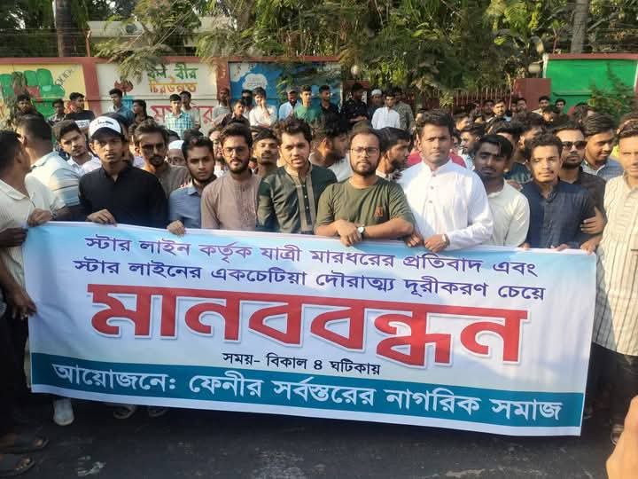 স্টার লাইন কর্তৃক যাত্রীকে মারধোর এর প্রতিবাদে ছাত্রজনতা মানববন্ধন