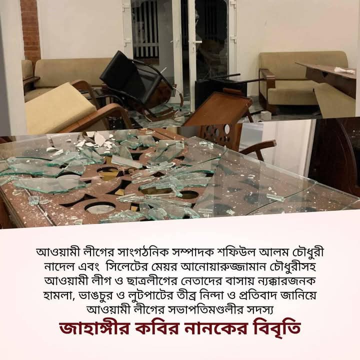 গতকাল সন্ধ্যায় আওয়ামী লীগের সাংগঠনিক সম্পাদক শফিউল আলম চৌধুরী নাদেল এবং সিলেটের মেয়র আনোয়ারুজ্জামান চৌধুরীসহ আওয়ামী লীগ ও ছাত্রলীগের নেতাদের বাসায় ন্যক্কারজনক হামলা, ভাঙচুর ও লুটপাটের তীব্র নিন্দা ও প্রতিবাদ জানিয়ে আওয়ামী লীগের সভাপতিমণ্ডলীর সদস্য জাহাঙ্গীর কবির নানকের বিবৃতি