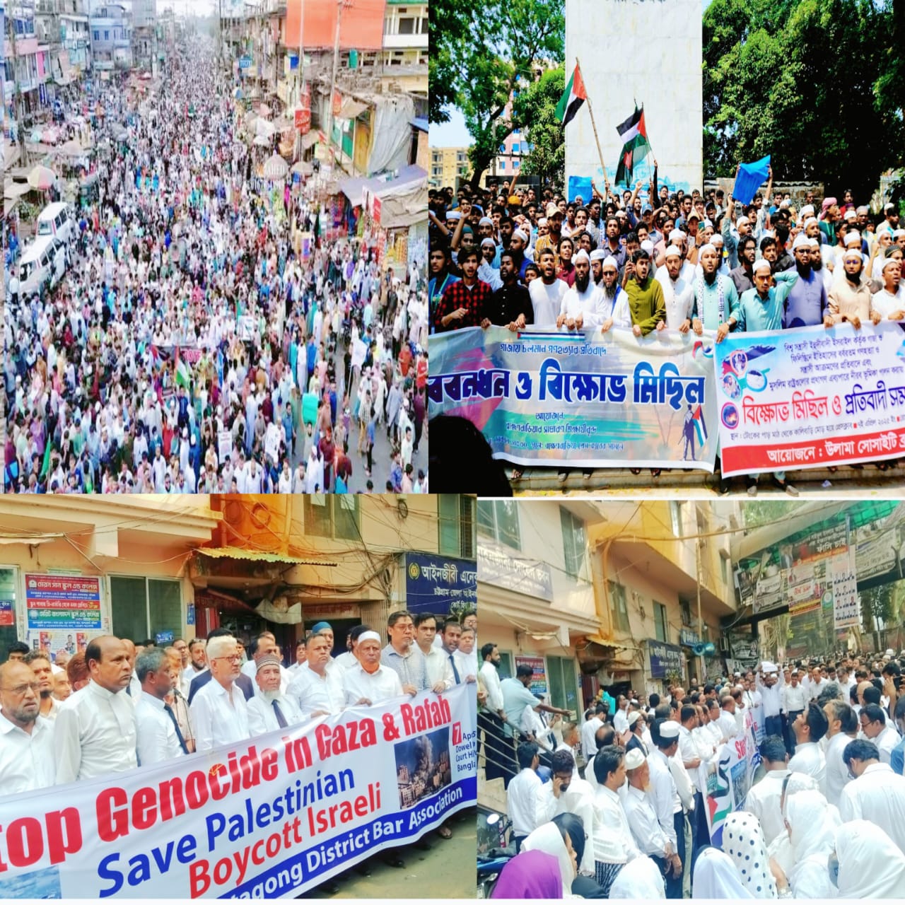 চট্টগ্রাম জেলা বিশেষ প্রতিনিধি,আহমদ রেজা:- ফলিস্তিনের গাজায় ইসরায়েলের নৃশংস গণহত্যার প্রতিবাদে চট্টগ্রাম জেলা আইনজীবী সমিতির উদ্যোগে দোয়েল ভবনের বদিউল সড়ক সংলগ্নে। নৃশংস হত্যার ও পন্য বরকট করার প্রতিবাদ সহ ব্যানারে এক বিশাল বিক্ষোভ সমাবেশ অনুষ্ঠিত হয়েছে। সোমবার, ৭ এপ্রিল ১ টা ৪০ মিনিটে জোহরের নামাজের পর আইনজীবির দোয়েল ভবনের সামনে প্রতিবাদ সমাবেশ করেন। এর আগে সমগ্র বাংলাদেশে বিভিন্ন মসজিদ থেকে মুসল্লিরা মিছিল সহকারে এসে তৌহিদি জনতার এই কর্মসূচিতে অংশ করেন।বিক্ষোভ মিছিলে বিভিন্ন রাজনৈতিক দল, সামাজিক ও সাংস্কৃতিক সংগঠনের নেতাকর্মীসহ বিভিন্ন শ্রেণি-পেশার মানুষ অংশগ্রহণ করেন। মিছিলকারীরা ইসরায়েল ও তার সহযোগী আমেরিকার বিরুদ্ধে নানা স্লোগান দেন এবং বিশ্বব্যাপী ইসরায়েলি পণ্য বয়কটের আহ্বান জানান। মিছিল শেষে আয়োজিত সংক্ষিপ্ত সমাবেশে বক্তারা বলেন, ইসরায়েল ফিলিস্তিনে যে বর্বরতা চালাচ্ছে তা মানবতা বিরোধী অপরাধের শামিল। তারা জাতিসংঘের নীরব ভূমিকার তীব্র সমালোচনা করে বলেন, আন্তর্জাতিক সম্প্রদায়ের নিষ্ক্রিয়তা বিশ্ববাসীর জন্য গভীর উদ্বেগের বিষয়। বক্তারা অবিলম্বে ইসরায়েলের আগ্রাসন বন্ধে কার্যকর আন্তর্জাতিক হস্তক্ষেপ এবং ফিলিস্তিনিদের ন্যায্য অধিকার ফিরিয়ে দেওয়ার জোর দাবি জানান। এদিকে একেই সময় ফিলিস্তিনের গাজায় ইসরাইলি বাহিনীর বর্বরোচিত হামলা ও গণহত্যার প্রতিবাদে চট্টগ্রাম ইনসানিয়াত বিপ্লবের তৌহিদী জনতার ব্যানারে বিক্ষোভ মিছিল অনুষ্ঠিত হয়েছে। মিছিলটি সকল মুসলিম জনতা ও এলাকার মোড় থেকে শুরু হয়ে বিভিন্ন স্থানে শৃংঙ্খলতার মাধ্যমে উপস্থিত হয়ে বক্তব্য রাখেন এবং শান্তিপূর্ণভাবে শেষ হয়। এ সময় বিভিন্ন স্কুল কলেজের শিক্ষক, ছাত্র-ছাত্রী এবং স্থানীয় সাধারণ মুসল্লিরা উপস্থিত ছিলেন।