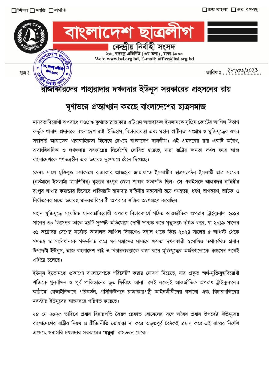 মুক্তিযুদ্ধের নেতৃত্বদানকারী সংগঠন হিসেবে বাংলাদেশ ছাত্রলীগ বাংলাদেশের সকল প্রগতিশীল, গণতান্ত্রিক ও মুক্তিযুদ্ধের পক্ষের শক্তিকে আহ্বান জানায়—চূড়ান্ত দায়মুক্তি ও বিচারহীনতার এই বিপজ্জনক দৃষ্টান্তের বিরুদ্ধে ঐক্যবদ্ধ গনতান্ত্রিক প্রতিরোধ গড়ে তুলতে।